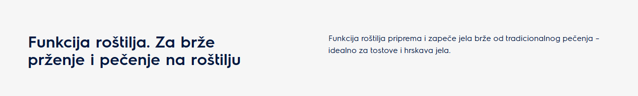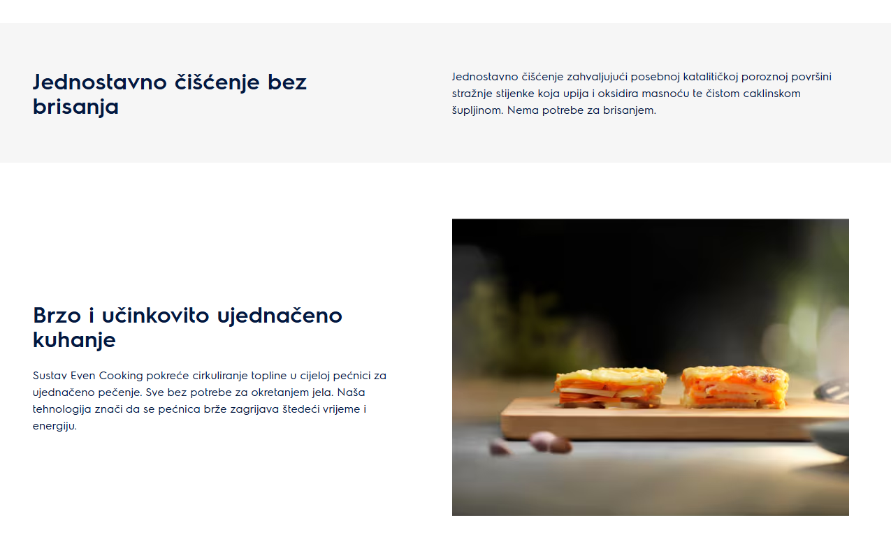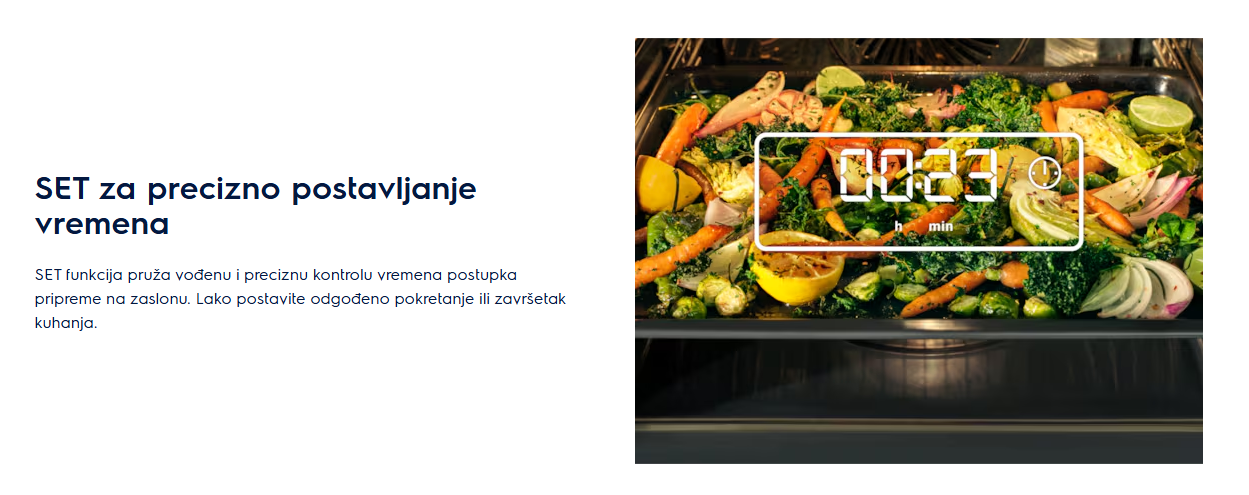 Funkcije pećnice: Light, kuhanje ventilatorom, pečenje vlagom i ventilatorom, donje grijanje, postavke za pizzu, turbo roštiljanje, odmrzavanje, tradicionalno pečenje, brzo roštiljanje