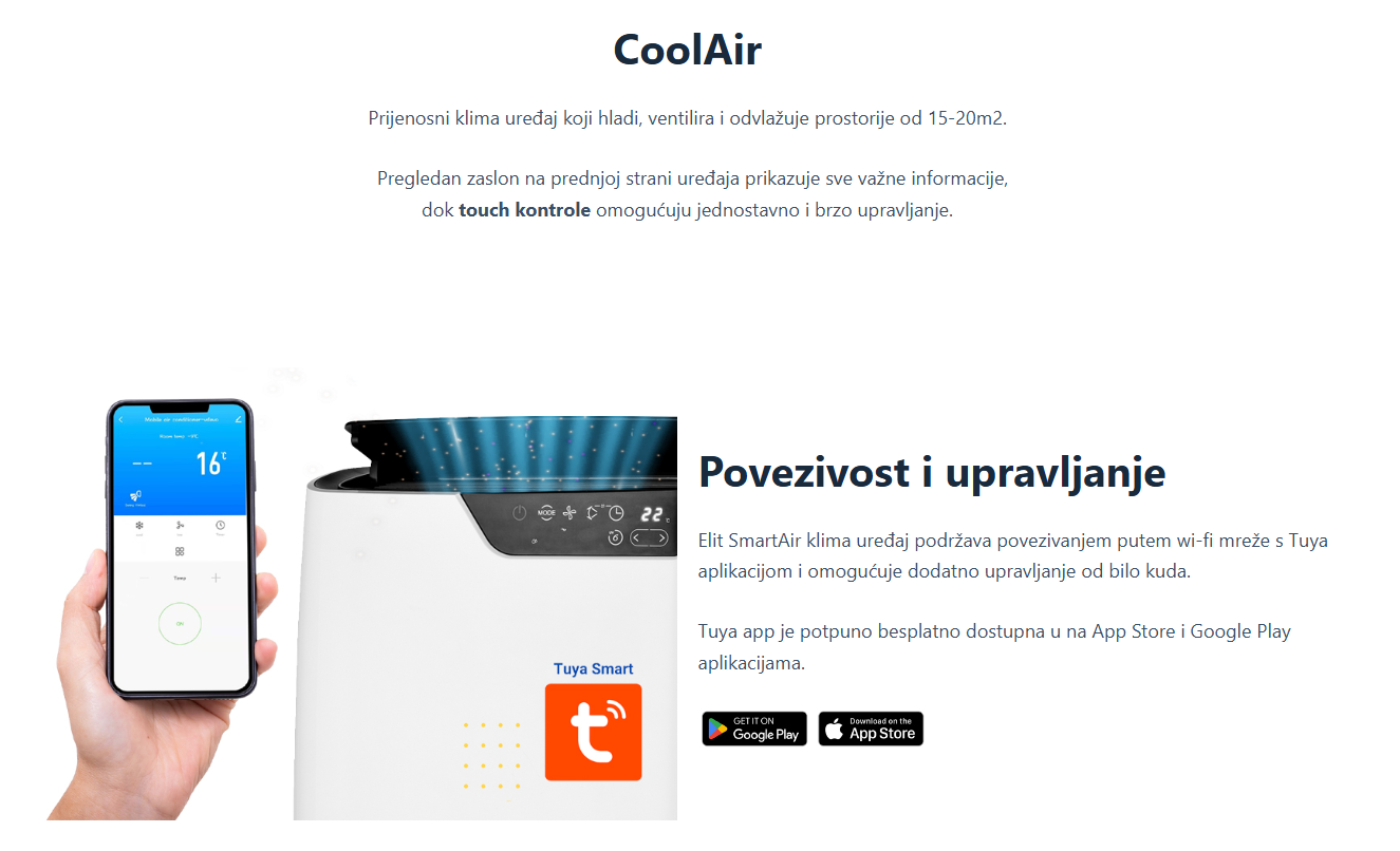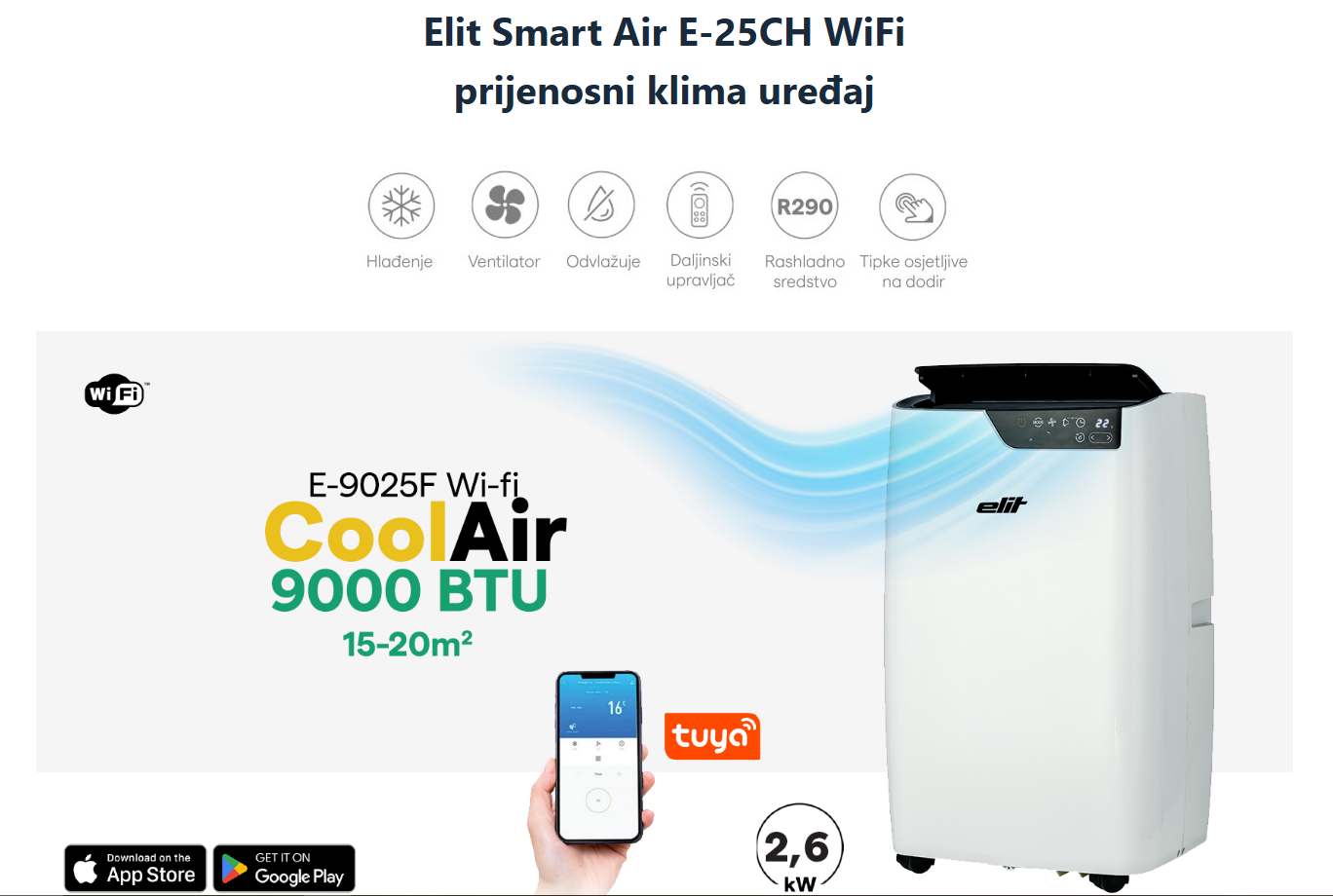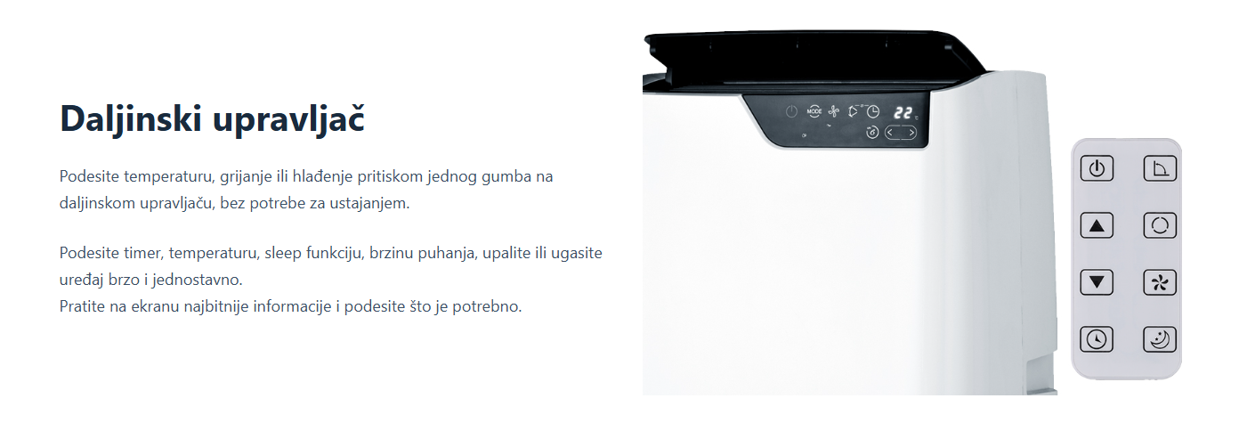 Prijenosni klima uređaj koji hladi, ventilira i odvlažuje prostorije od 15-20 m2. Pregledan ekran na prednjoj strani uređaja prikazuje sve važne informacije, dok touch kontrole omogućuju jednostavno i brzo upravljanje. Dolazi s daljinskim upravljačem za još lakše upravljanje i podešavanje željene temperature te dodacima za spajanje na izlaz iz prostorije.