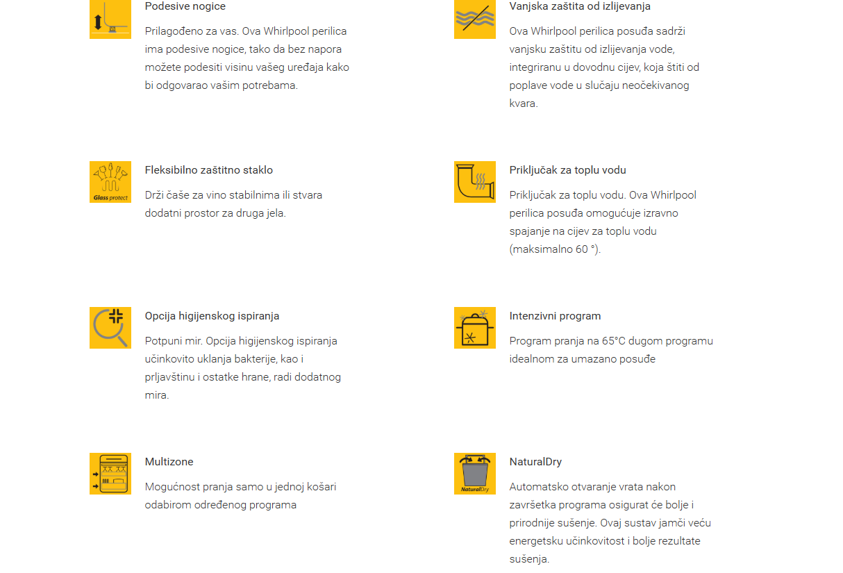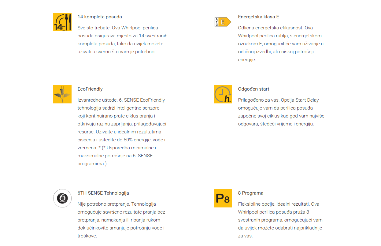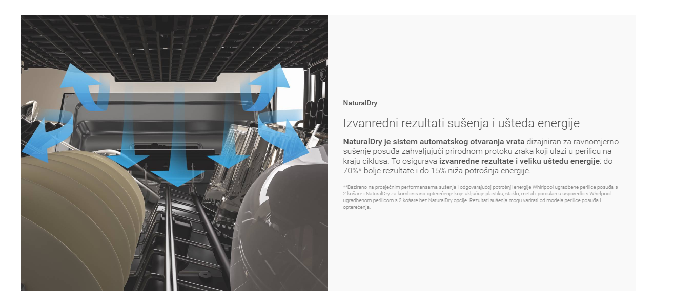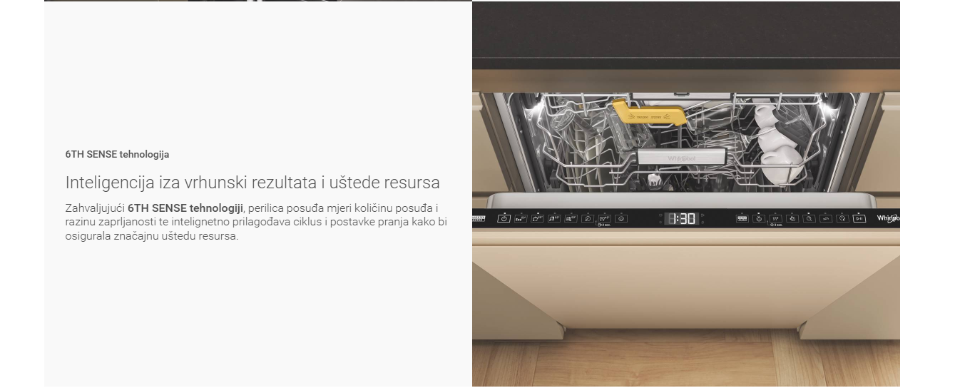 Ova Whirlpool ugradbena perilica posuđa svojim funkcijama osigurava uvijek čisto i suho posuđe. Najtvrdokornija prljavština je uklonjena uz uštedu vremena i resursa. Napredne tehnologije ove perilice posuđa su: 6th Sense tehnologija sa senzorima koji će otkrit veličinu opterećenja i razinu zaprljanosti kako bi se u skladu s tim prilagodila temperatura, vrijeme i snaga ciklusa pranja, s naglaskom na uštedu uz najbolje rezultate pranja. NaturalDry sistem sušenja nakon završetka ciklusa otvara vrata kada temperatura iznutra padne na oko 40°C. Zahvaljujući tome, posuđe je suho uz nižu potrošnju energije, a kuhinjski namještaj je ostao siguran od vruće pare.