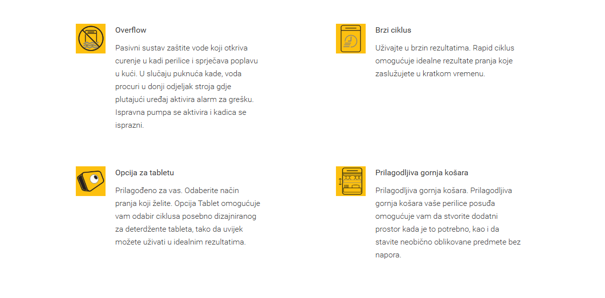 Programi: Staklo, Opcije odgode početka: Postojani, Intensive 65°, Rapid, Eco, Dostupnost kratkog programa, Pretpranje, Vrijeme odgode max. (h): 24, Eco 50, Tiho