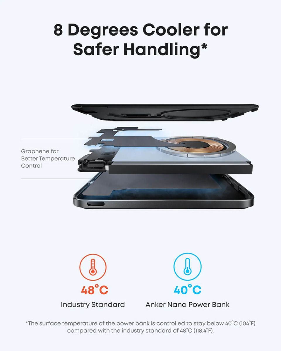 Sa izuzetnim svojstvima hlađenja grafena, dvostrukim NTC čipovima i pametnim postavkama punjenja, ova power bank ostaje ispod 40°C, 14°C niže od industrijskog standarda. Ovo omogućava sigurnije i pouzdanije punjenje.