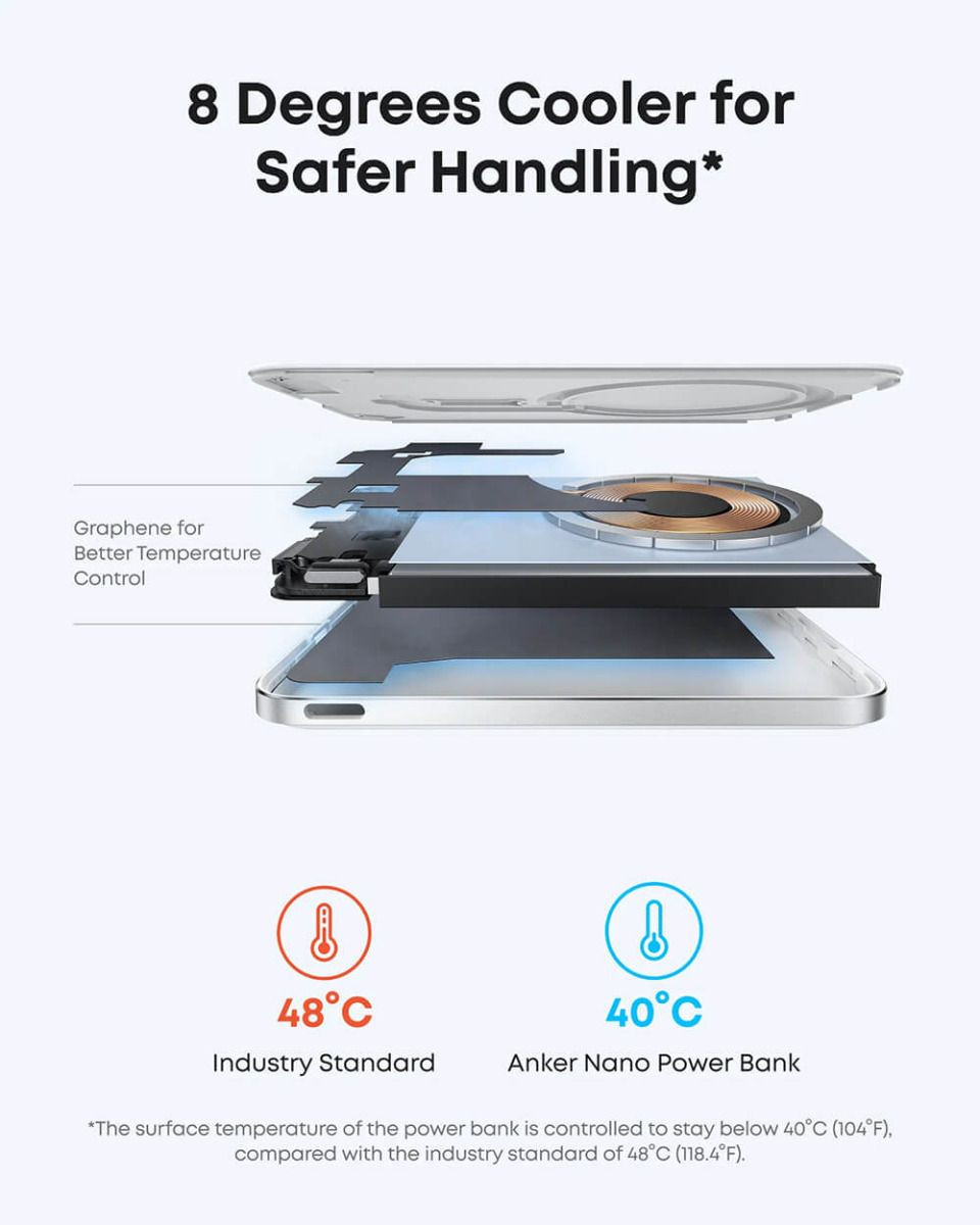 Sa izuzetnim svojstvima hlađenja grafena, dvostrukim NTC čipovima i pametnim postavkama punjenja, ova power bank ostaje ispod 40°C, 14°C niže od industrijskog standarda. Ovo omogućava sigurnije i pouzdanije punjenje.