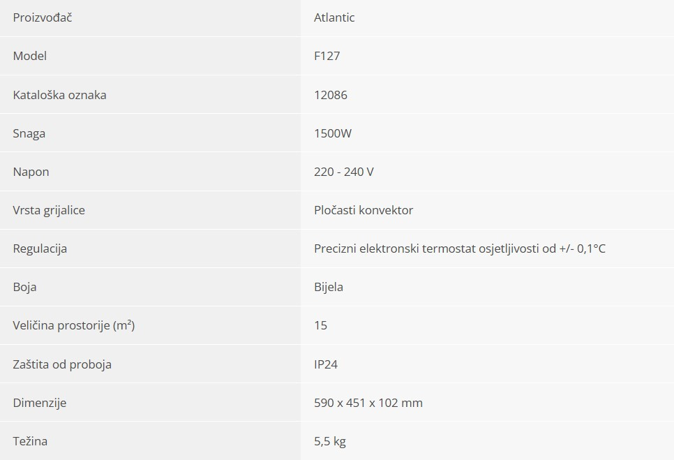 Konvektor grijalica; Samostojeća ili zidna; Maksimalna snaga: 2000W; 3 postavke grijanja: 750W / 1250W / 2000W; Podesivi termostat; Automatsko isključivanje; Zaštita od pregrijavanja; Zaštita od smrzavanja; Neto težina: 3.25 kg; Boja: Bijela; Garancija: 12 mjeseci.
