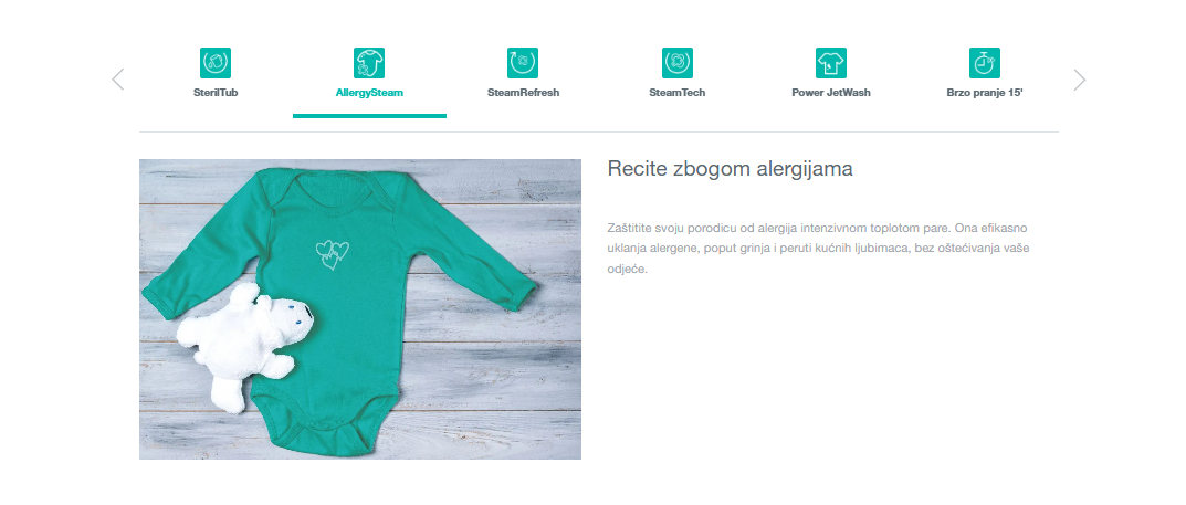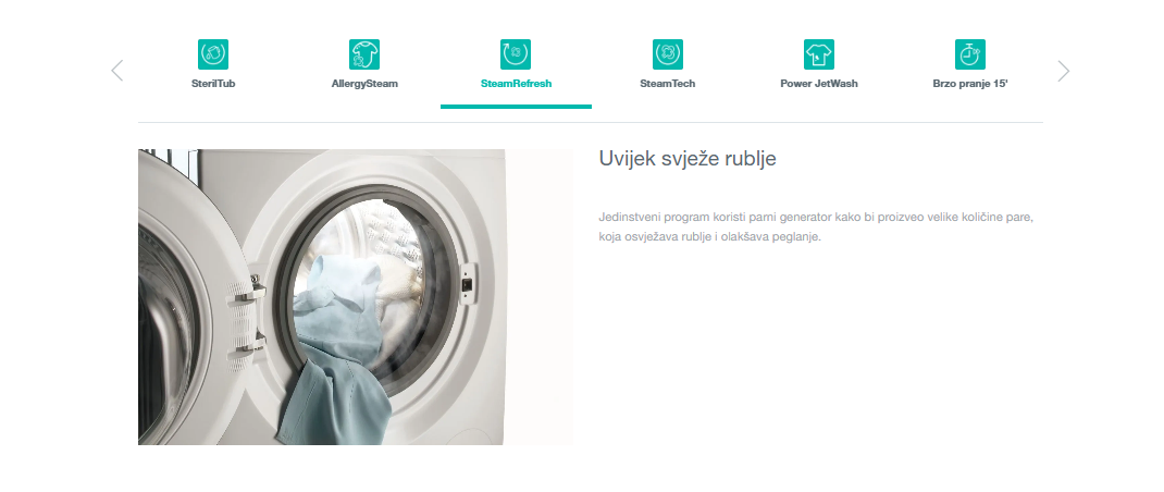 Programi sušenja: Program za osvježavanje parom, Airing, Baby, ExtraHygiene - dodatna higijena, Cotton, Synthetics