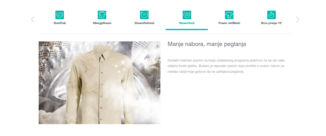 Dodatne funkcije: Programi s parom (Program za ravnanje nabora sa parom i osvježavanje parom), Brzi program, Niža temperatura sušenja, Osvježavanje, Polovično punjenje, Dodavanje veša, Extra rinsing, Brzi program, AntiCrease - sistem protiv gužvanja, Podešavanje temperature, Isključivanje centrifuge, Jednostavno peglanje, Pretpranje, Funkcija pare