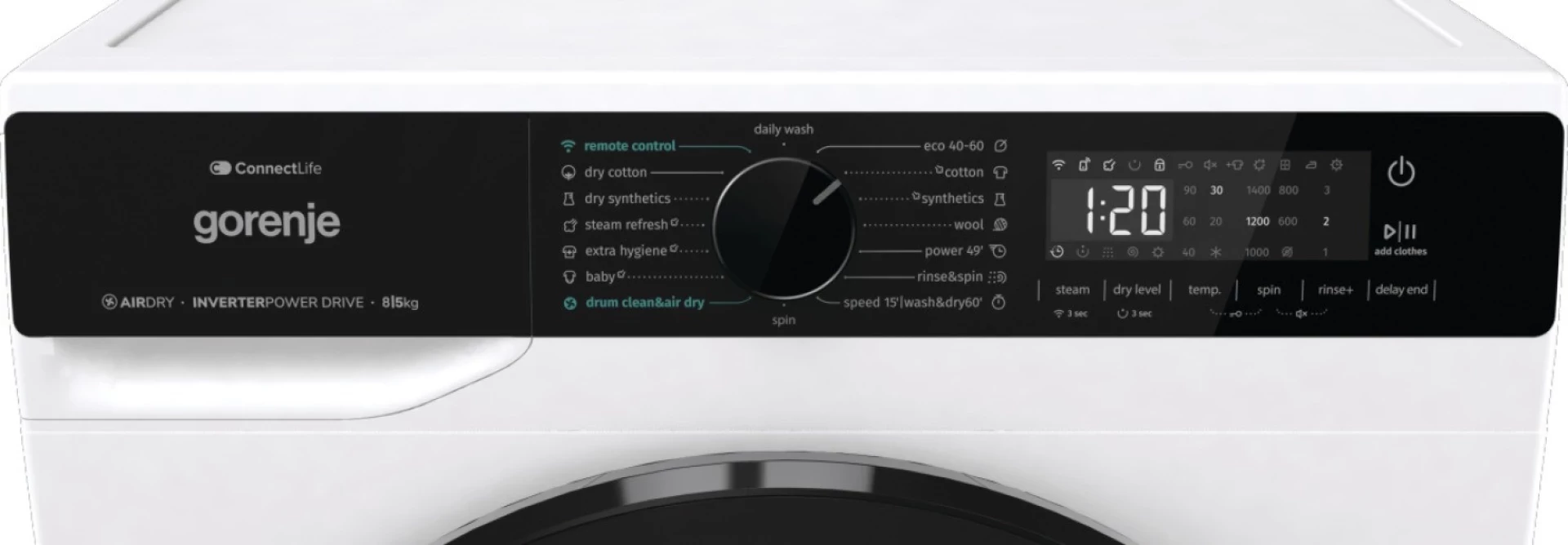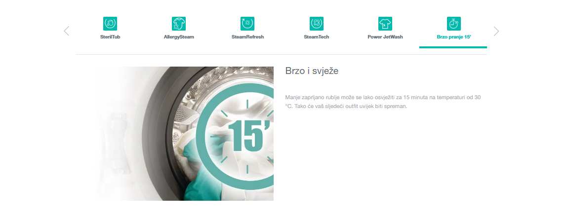 Posebni programi: Brzo pranje 15', Eco 40–60°C, ExtraHygiene - dodatna higijena, Wash&Dry, Daljinsko upravljanje, Power 49', DrumClean & AirDry