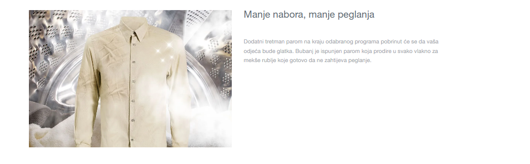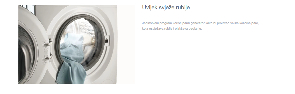 Dodatne funkcije: Voice, Programi s parom (Program za ravnanje nabora sa parom i osvježavanje parom), Osvježavanje, Podešavanje vremena, Polovično punjenje, Dodavanje veša, Extra rinsing, Brzi program, Povećana razina vode, AntiCrease - sistem protiv gužvanja, Podešavanje temperature, Isključivanje centrifuge, Pretpranje, Funkcija pare