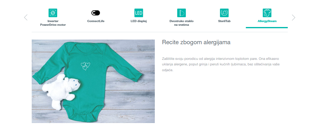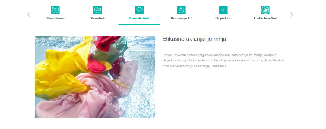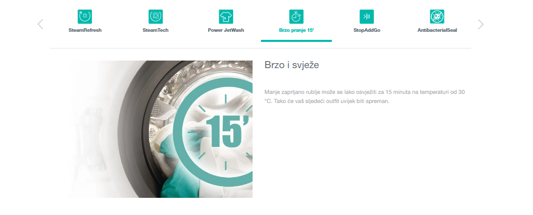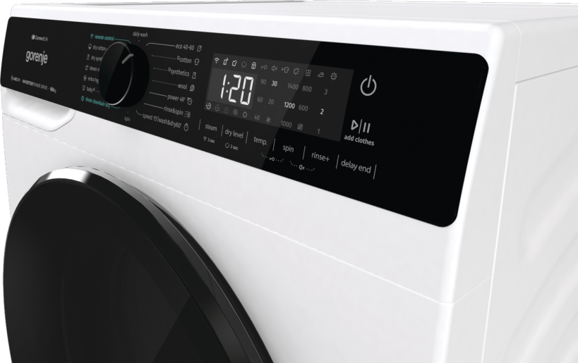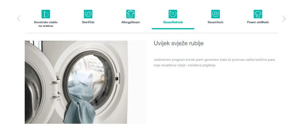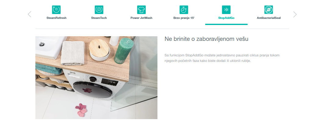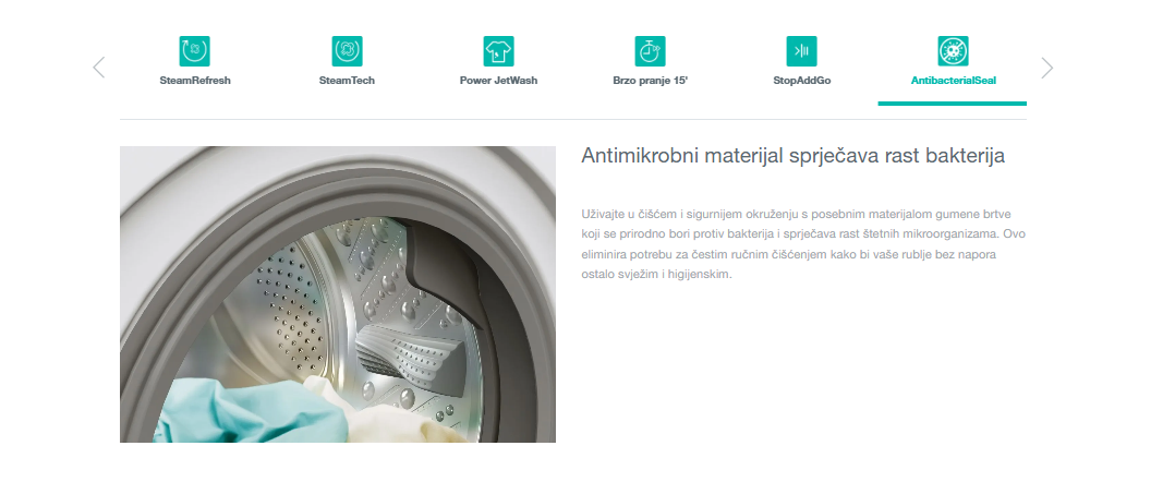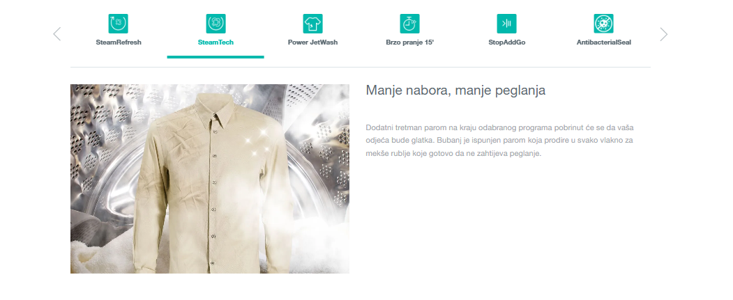 Dodatne funkcije: Voice, Programi s parom (Program za ravnanje nabora sa parom i osvježavanje parom), Polovično punjenje, Dodavanje veša, Extra rinsing, Brzi program, AntiCrease - sistem protiv gužvanja, Podešavanje temperature, Isključivanje centrifuge, Pretpranje, Funkcija pare