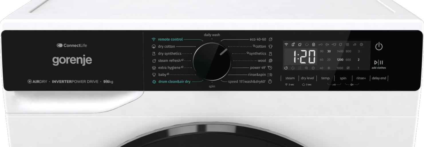 Posebni programi: Power 49', Daljinsko upravljanje, Wash&Dry, Eco 40–60°C, Brzo pranje 15', DrumClean & AirDry