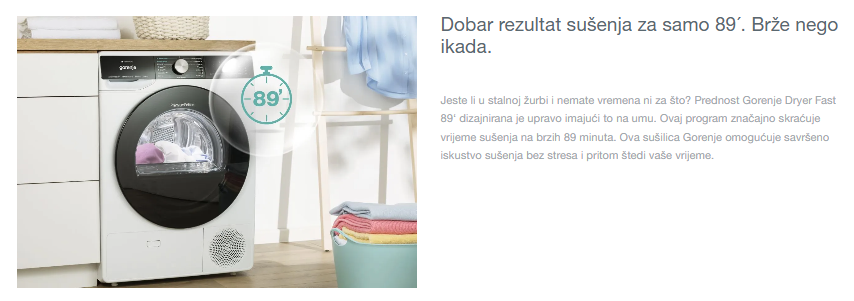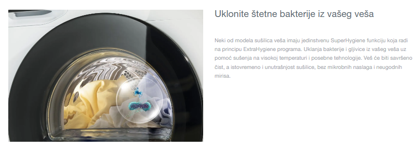 Programi sušenja: Baby, Daljinsko upravljanje, Eko-pamuk, Pamuk za peglanje, Mix suho, Sintetika/miks za peglanje, Pamuk za spremanje, Vuna, Sportska odjeća, Košulje, Posteljina, ExtraHygiene - dodatna higijena, Vremensko sušenje, Osjetljivo, Fast 89'