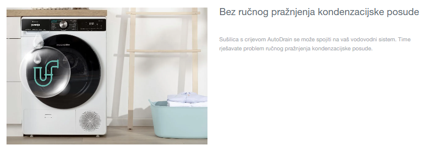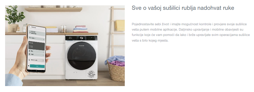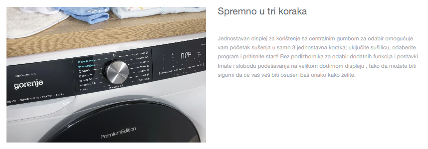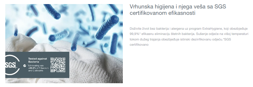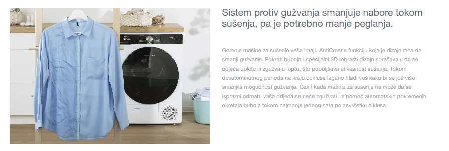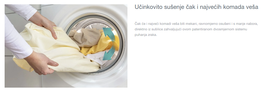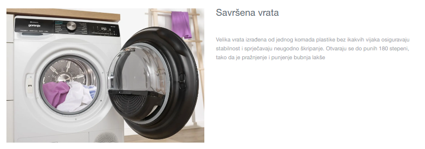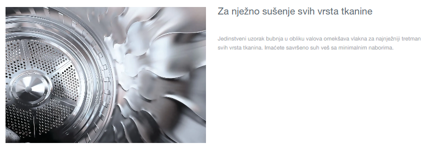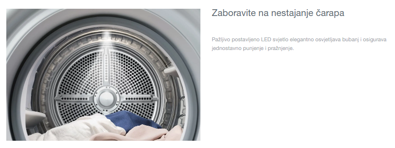 Dodatne funkcije: AntiCrease - sistem protiv gužvanja, Polovično punjenje, Podešavanje razine sušenja, Vrijeme odgode