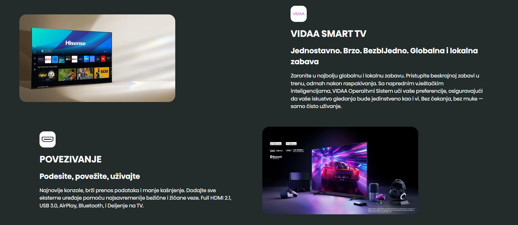 Povezivanje: 4x HDMI 2.1, 1x USB 3.0, 1x USB 2.0, S/PDIF izlaz, audio (L/D) ulaz, izlaz za slušalice, 2x RF tjunera, kompozitni (AV) ulaz, mrežni RJ45 port, Wi-Fi tehnologija: IEEE 802.11 a/b/g/n/ac-2.4G,5G, Bluetooth, Svjetlosni senzor, Standardni interfejs (CI+) V2.0
