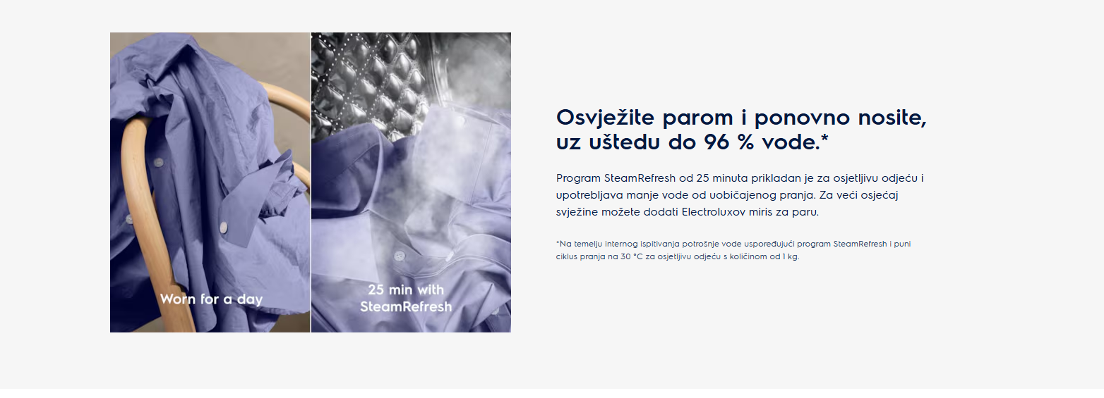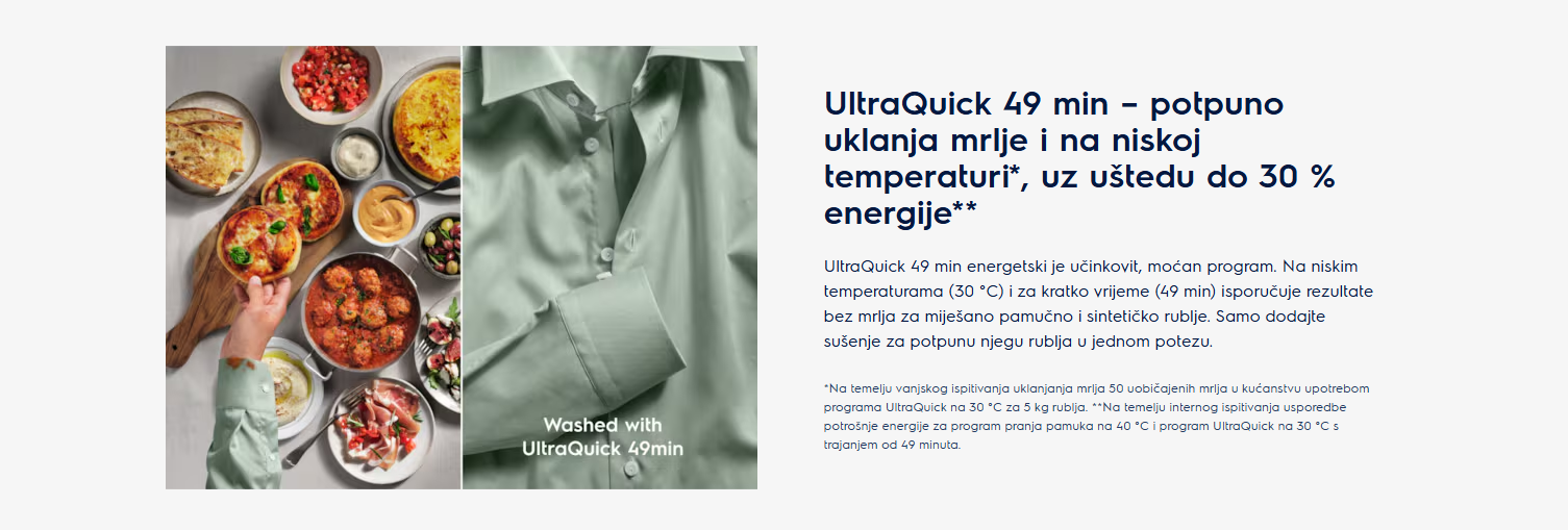 Programi: pamuk, osjetljivo, Eco 40-60, Hygiene, traper, čišćenje mašine, Onego 20/60Min, odjeća korištena na otvorenom, ispiranje, centrifuga/ odvodnja, para osvježavanje, sintetika, Ultraquick 49Min, vuna