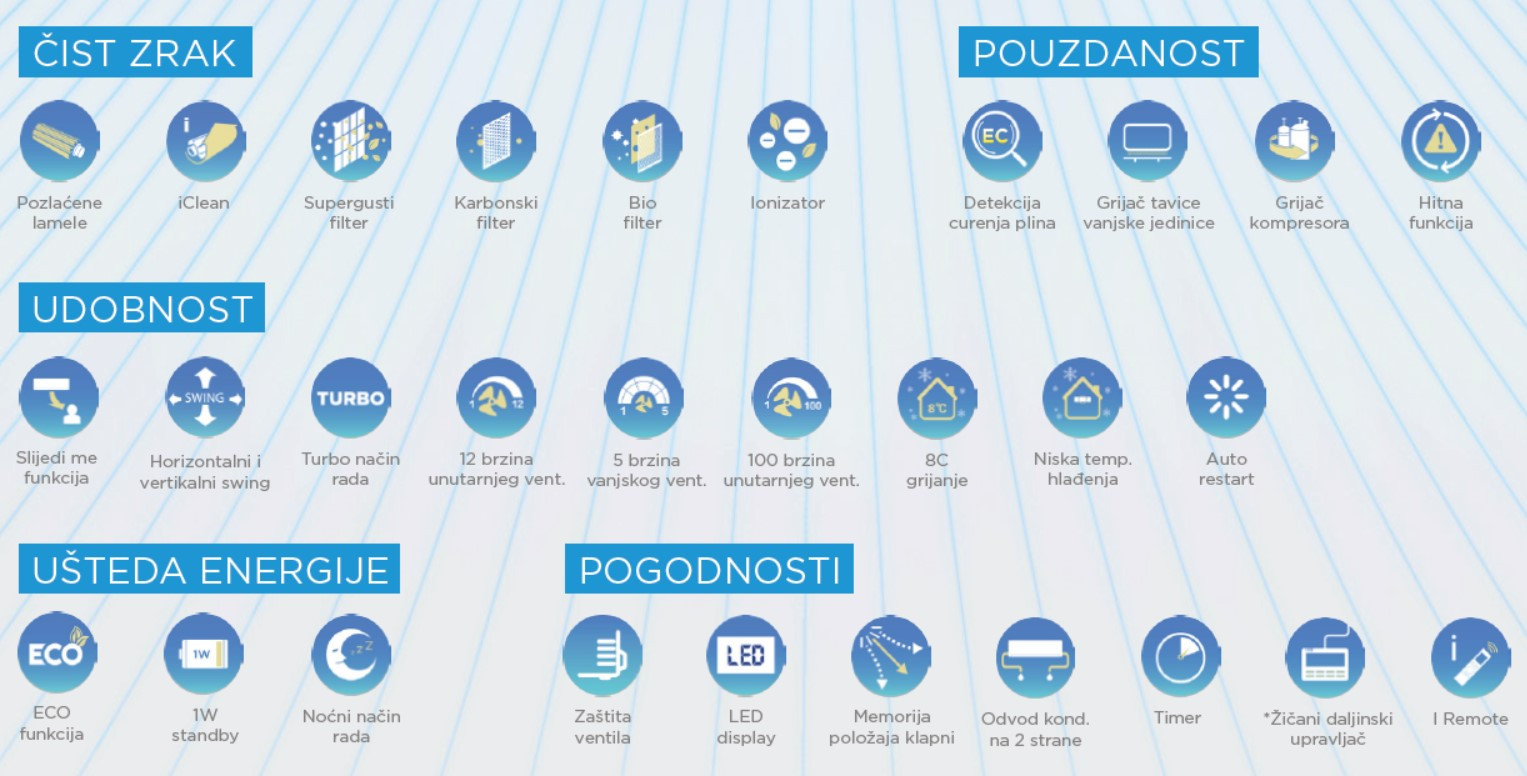 8C grijanje – U grijanju klima se može podesiti na temperaturu 8°C što omogućuje održavanje te temperature u prostoru i sprječava smrzavanje unutar prostora. Posebno pogodno za kuće u kojima se ne boravi u zimskim danima.