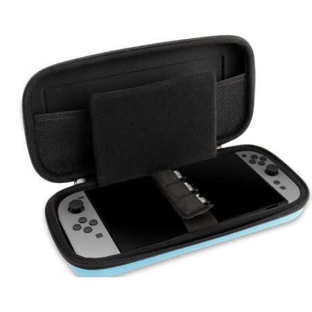 In this hard-shell black carrying case, you can safely and securely transport your favorite Nintendo Switch, Switch Lite or Switch - OLED Model game console, including the attached Joy-Con controllers in the case of the Switch and Switch - OLED Model consoles. A padded divider in the middle of the case ensures that the consoles screen does not suffer any scratches during transport, and in the mesh pocket on the other side you will find enough space for the power adapter and cards with other games. The case also includes a removable mid-base for the Switch Lite.
