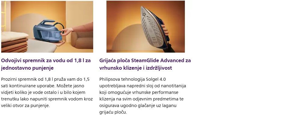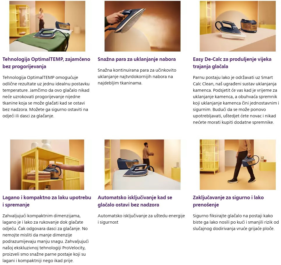 Funkcije: vertikalno peglanje, Eco režim, sistem protiv kamenca (odvojivi kolektor), automatsko isključivanje, sistem zaključavanja za sigurnost
