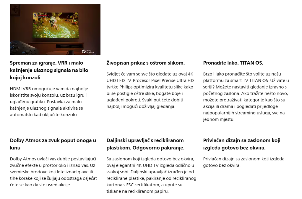 Pripremite se za još više užitka! Ovaj 4K UHD smart TV omogućuje vam jednostavan pristup omiljenim streaming uslugama, a ima i besplatne kanale. Dobit ćete oštru sliku, besprijekorno igranje i realističan Dolby Atmos zvuk.