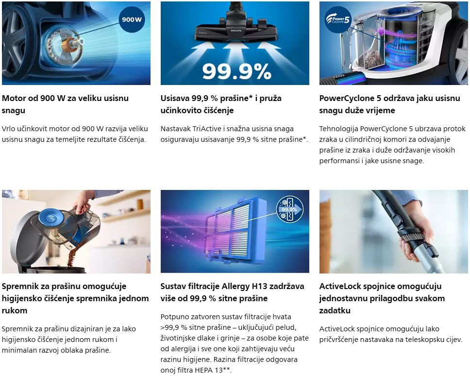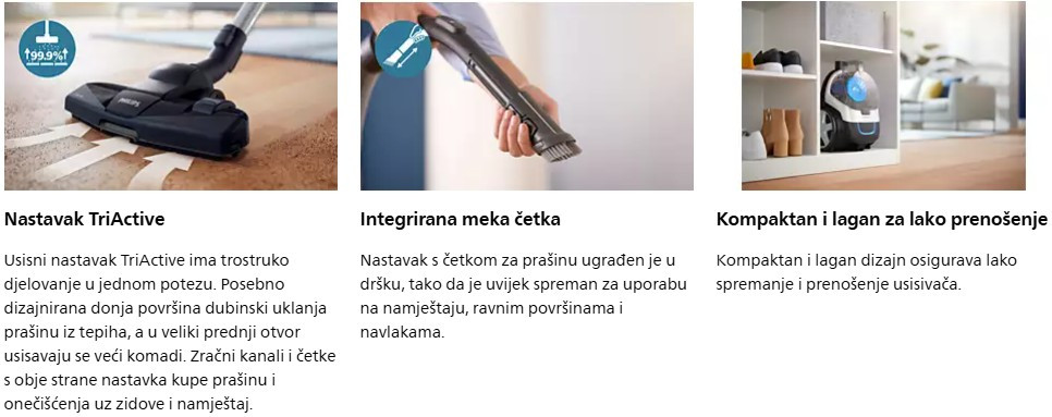 Philips usisivač bez vrećice iz serije 3000 kombinira kompaktni dizajn i maksimalan učinak čišćenja. Uživajte u dubinskom čišćenju kuće koje omogućuje tehnologija PowerCyclone 5 i naš usisni nastavak TriActive s tri istodobne akcije čišćenja.