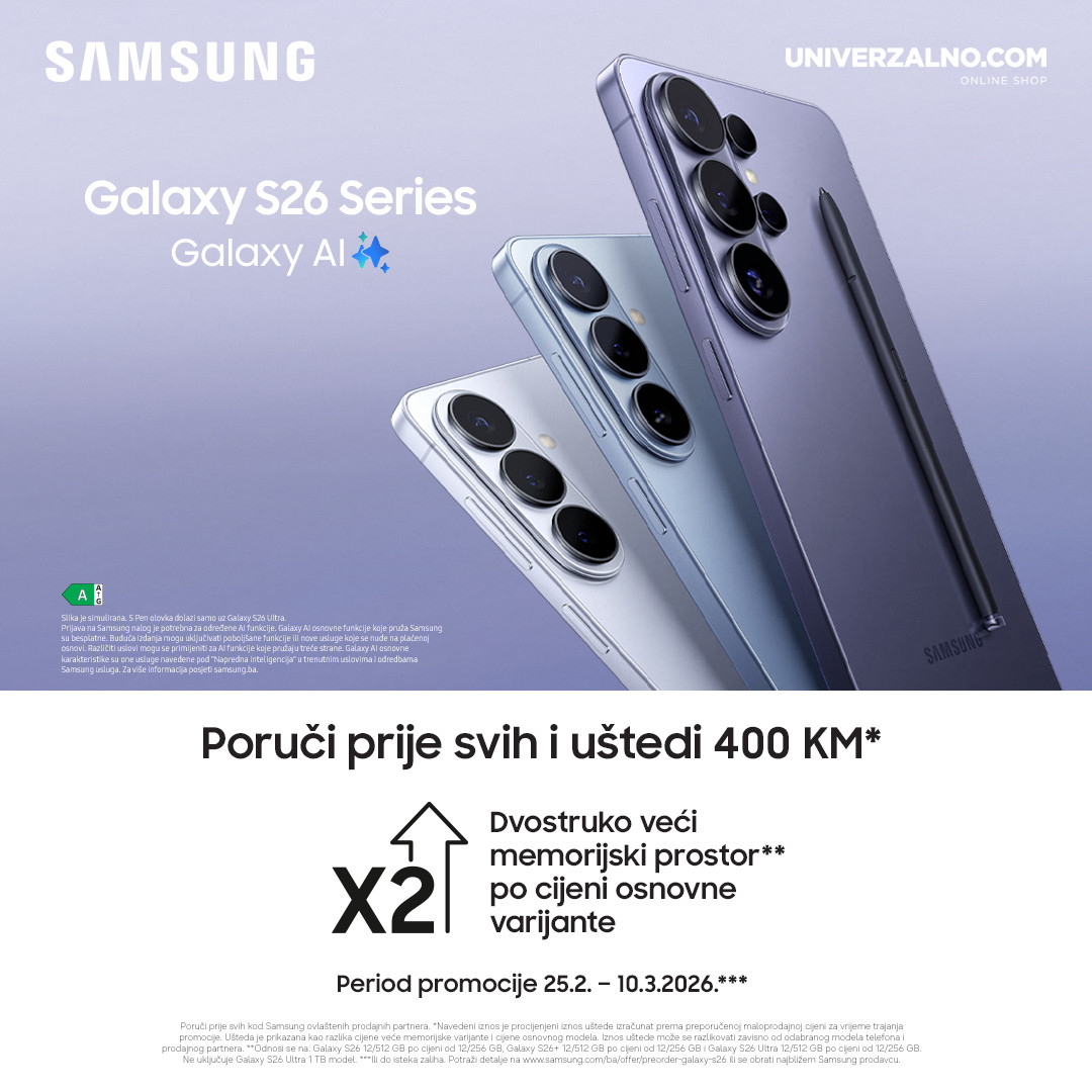 U promotivnom periodu Galaxy S26 serije dobijaš jaču memorijsku verziju po cijeni osnovne - što znači do 400 KM uštede u odnosu na standardnu ponudu.