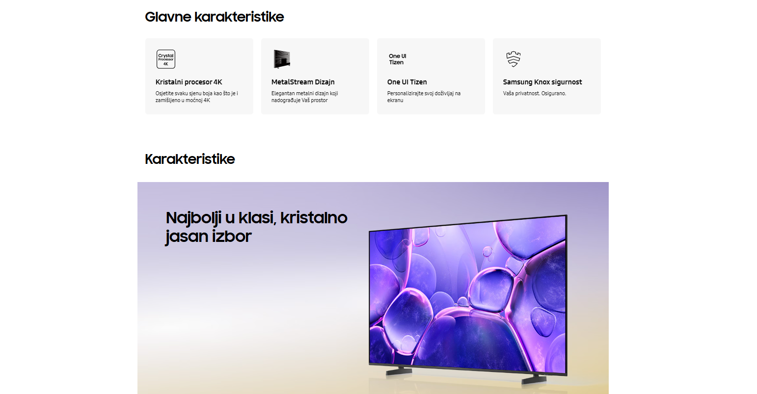 Povezivanje: 3xHDMI, 1xUSB-A, Wi-Fi 5, Bluetooth 5.3, HDMI (High Frame Rate): 4K 60Hz (za HDMI 1/2/3), HDMI Audio Return Channel: eARC/ARC, Anynet+ (HDMI-CEC), Ethernet (LAN), CI utor, RF ulaz (zemaljski/kabelski ulaz)