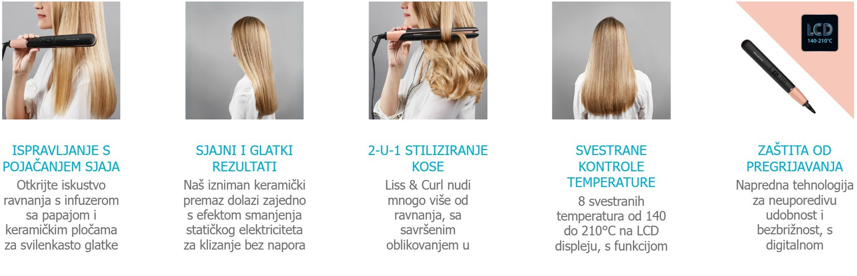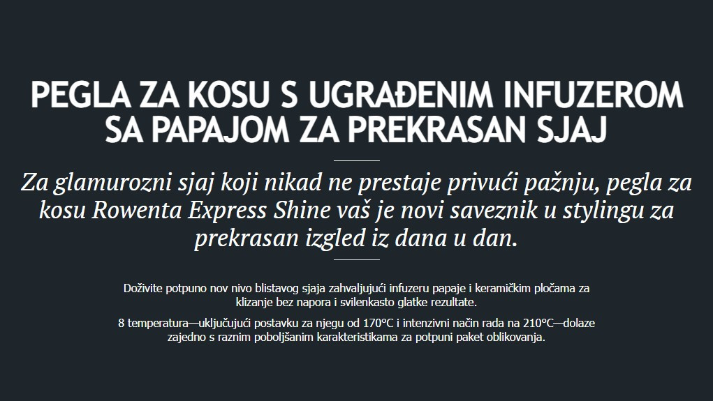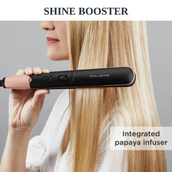 Rowenta Express Shine podiže ravnanje na potpuno novi nivo, s infuzerom od papaje i keramičkim pločama koje pružaju blistav sjaj. Ovaj aparat za ravnanje kose nudi cijeli paket: 8 temperatura uključujući postavku za njegu od 170°C i intenzivni način rada na 210°C, 2-u-1 svestranost za uvijanje bez napora, naprednu tehnologiju za sprječavanje pregrijavanja, učinkovitost jednim potezom kroz sistem plutajućih ploča, brzo vrijeme zagrijavanja od 30 sekundi i više