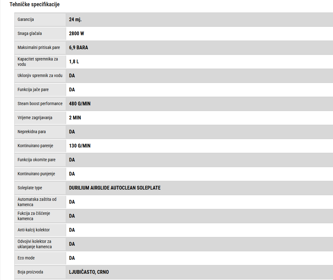 Funkcije: vertikalno peglanje, Eco režim, sistem protiv kamenca (odvojivi kolektor), automatsko isključivanje, sistem zaključavanja za sigurnost
