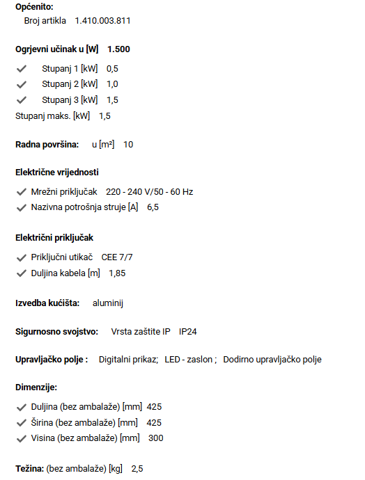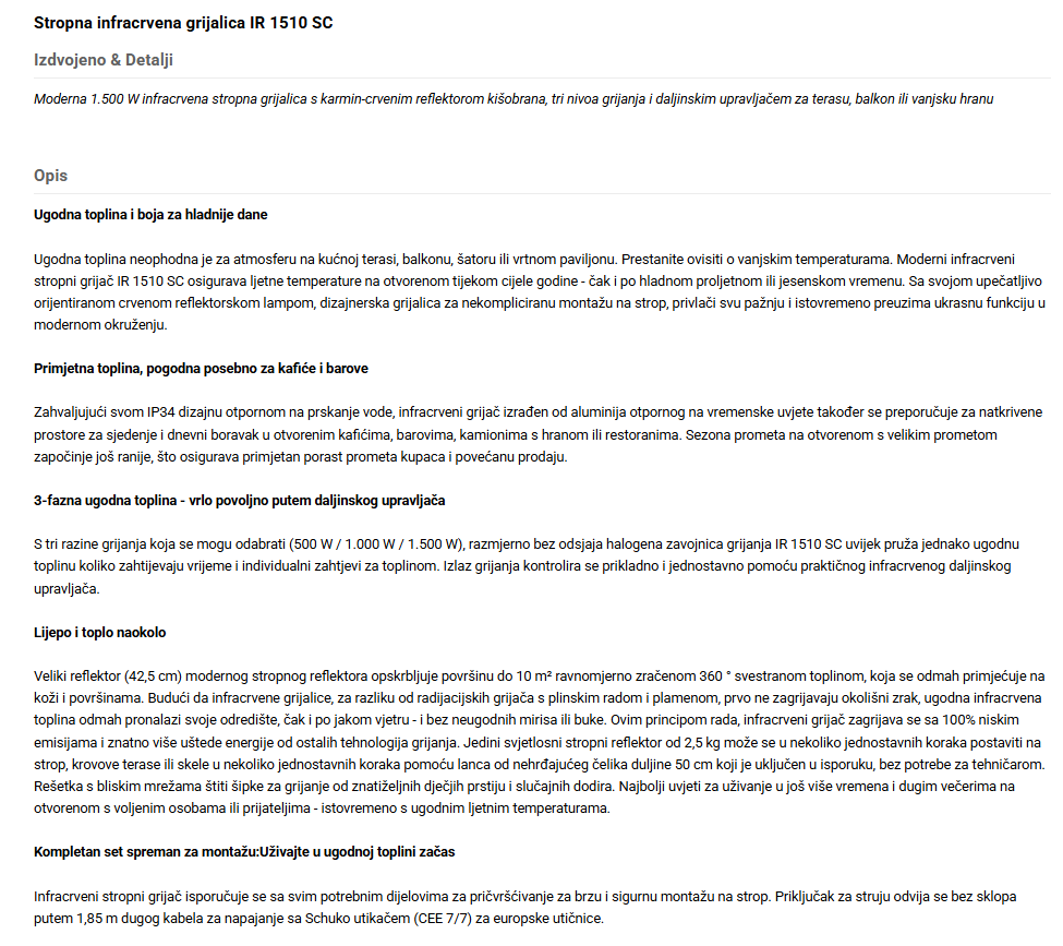 Halogena infracrvena cijev IR 1510 SC generira toplinu prema prirodnom principu sunčevog zračenja. A posebno je energetski učinkovit, jer se velik dio utrošene energije pretvara u izravnu toplinu. Ne zagrijava se okolišni zrak, već predmeti i ljudi u neposrednoj blizini infracrvene grijalice apsorbiraju zračenje, pohranjuju ga i također ispuštaju natrag u okoliš kao sekundarno zračenje. Toplina se distribuira bez buke i bez podizanja prašine pomoću ventilatora, što znači da astmatičari i alergičari mogu slobodno disati u neposrednoj blizini grijalice koja zrači.