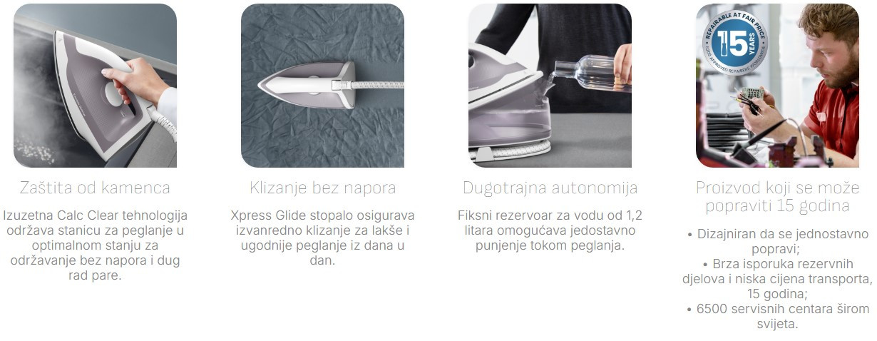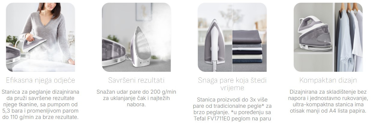 Otkrijte Tefal Express Optimal parnu stanicu, savršeno rješenje za sve vaše potrebe njege odjeće. Nudi snažne performanse i do 3x više pare od tradicionalne pegle* - pumpu od 5,3 bara, varijabilnu paru do 110 g/min i udar pare do 200 g/min - sa posebnim funkcijama kao što je Calc Clear tehnologija za održavanje bez napora i Xpress Glide stopalo pegle visokih performansi. Sve to, u ultra-kompaktnom dizajnu za potpunu udobnost.