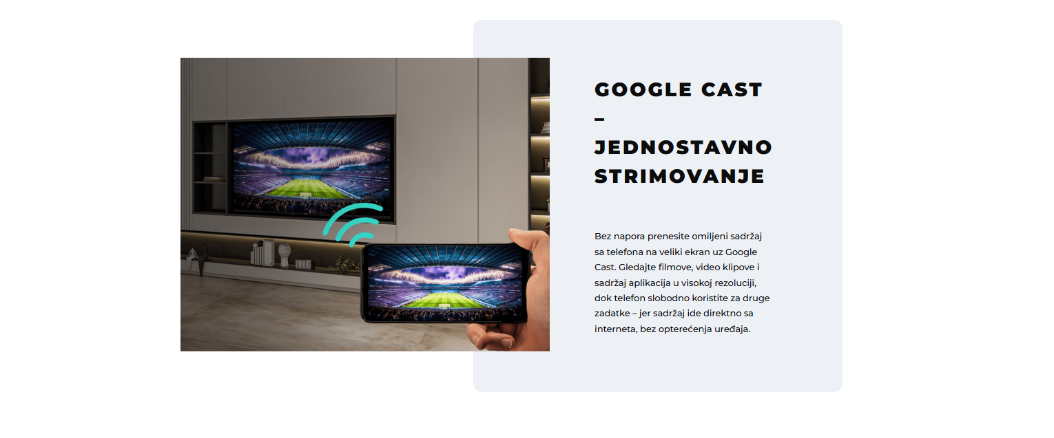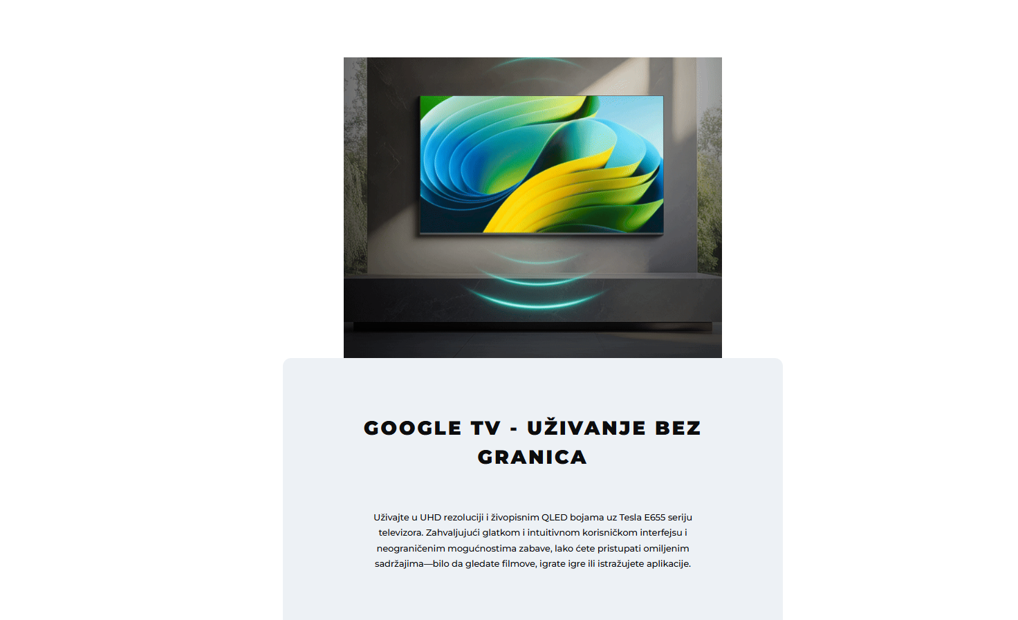 Novi Tesla QLED televizori sa Google TV operativnim sistemom donose zadivljujuću 4K sliku, personalizovani sadržaj i besprijekorno strimovanje uz pomoć Google Cast i Google Assistant funkcija – sve u okviru jednog pametnog, intuitivnog iskustva.