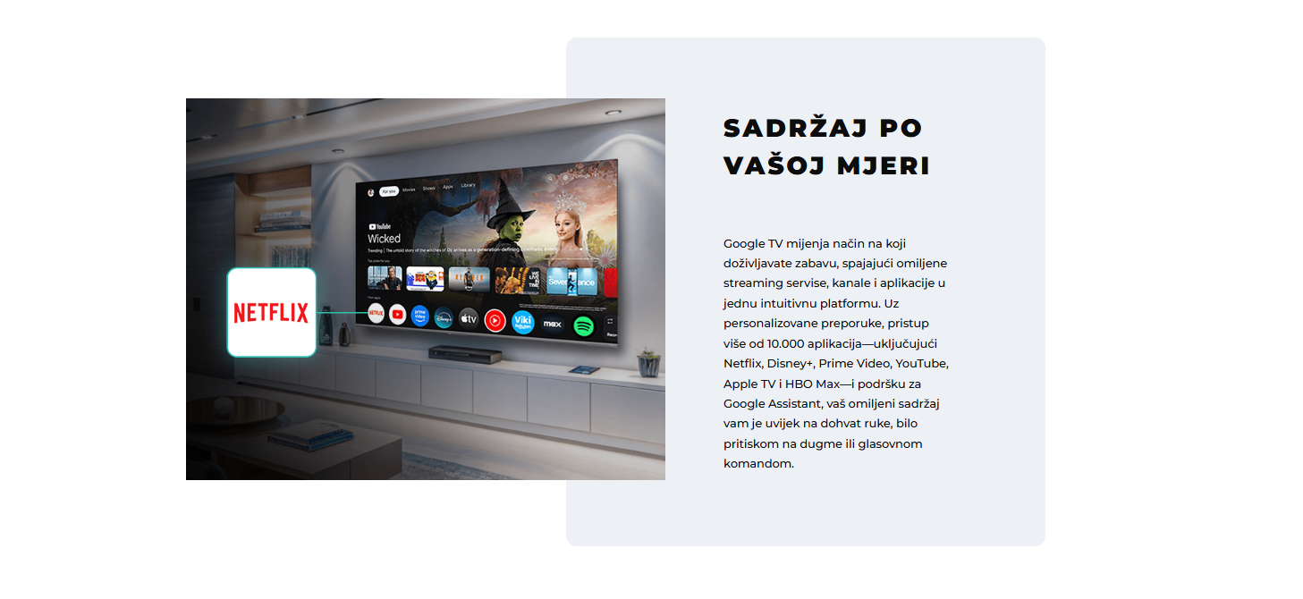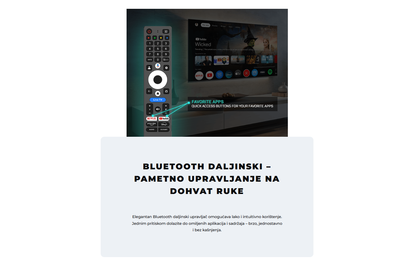 Preinstalirane aplikacije za Smart TV Gogle Play, Netflix, Prime video, YouTube, Media player…