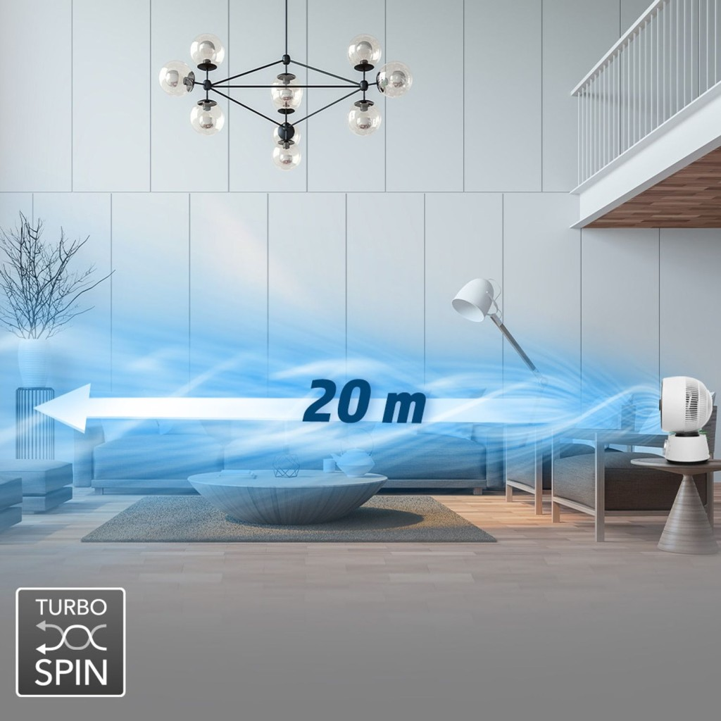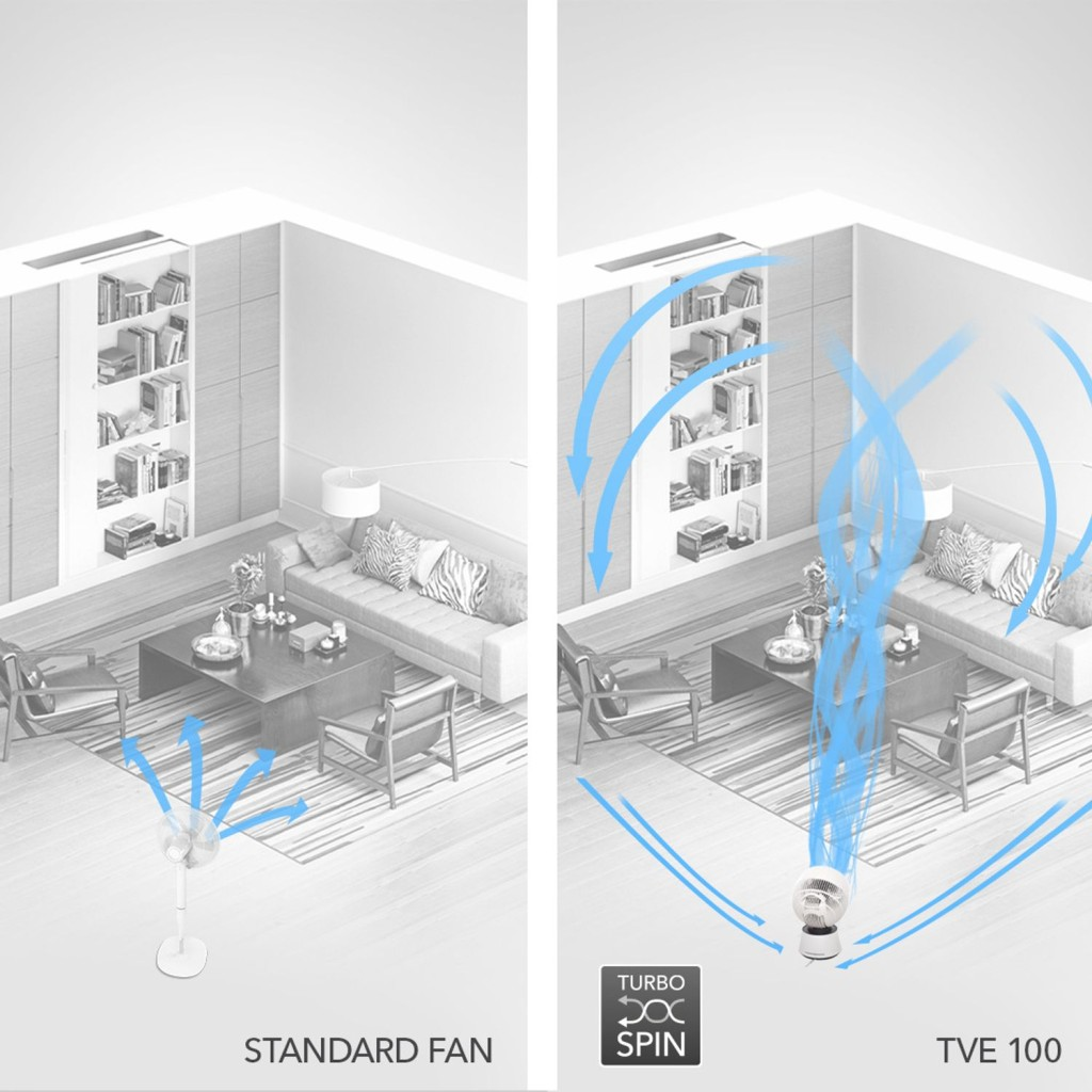 Imamo rješenje: Turbospin! Svojom Turbospin tehnologijom TVE 100 stvara ravnomjernu cirkulaciju zraka u cijeloj prostoriji. Zrak se uvlači u ventilator sa stražnje strane. Tu susreće tri posebno snažno zakrivljene lopatice rotora iznimno brzog rotirajućeg impelera. Ove duboko zakrivljene lopatice ventilatora osiguravaju posebno snažnu turbulenciju i enormno ubrzanje strujanja zraka. Ali to nije sve: spiralna, aerodinamično oblikovana zaštitna rešetka ventilatora nije samo atraktivan naglasak dizajna, već i potiče turbulenciju. Zračni tok, koji je sada jako komprimiran i kovitlajući se poput komprimiranog tornada, izbija iz uređaja kao rotirajući stup zraka i prodire duboko u prostoriju. Zone hladnog i toplog zraka prostorije probijaju se i miješaju strujanjem zraka. Izlazni tok zraka udara u suprotni zid ili strop i tamo se reflektira na sve strane. Zrak struji natrag u stražnji dio ventilatora u stalnoj cirkulaciji preko bočnih zidova i stropa. Tu se opet usiše i ciklus počinje ispočetka. Ovaj učinkovit princip turbospin miješa i maksimalno cirkulira zrak u vašoj sobi. Razlika između hladnije temperature poda i toplije temperature stropa značajno se smanjuje i umjesto toga osjećate ravnomjerniju temperaturu u cijeloj prostoriji.