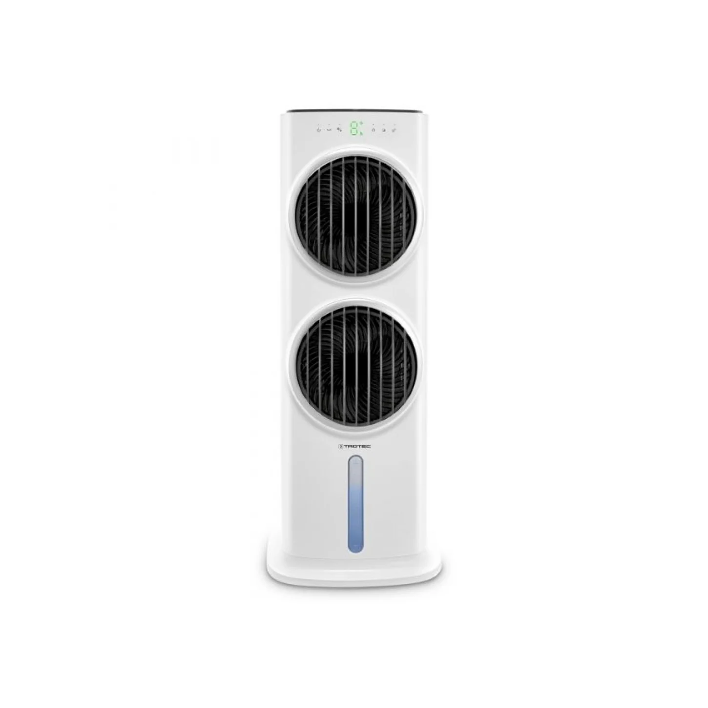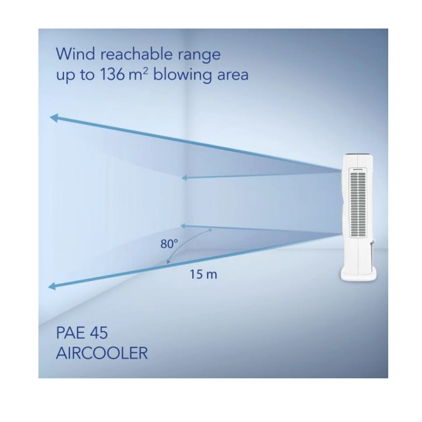 Suvremeni Aircooler PAE 45 s infracrvenim daljinskim upravljačem suprotstavlja se vrućim ljetnim temperaturama osvježavajućim ledenim zrakom iz dva puhala visokih performansi s Turbo Spin tehnologijom i dometom od 15 metara. Grijani uredi, dnevne sobe ili trgovine mogu se brzo ohladiti na ugodnu sobnu temperaturu uz ne samo vizualno izvanredan hladnjak zraka. PAE 45 hladi svoj protok zraka na 2 - 3 C° i na taj način osigurava optimalnu temperaturnu razliku između vanjske i unutrašnje temperature, tako da tijelo nema nepotreban stres. Uz prirodno hlađenje isparavanjem, elegantno tanki hladnjak zraka 3 u 1 (zračno hlađenje, osvježavanje zraka, ventilacija) vlaži i čisti zrak u sobi kako bi se osvježio higijenski čistim i optimalno vlaženim hladnim zrakom čak i po maksimalnim ljetnim temperaturama. Izlaz zraka dvostrukog ventilatora može se regulisati u pet stupnjeva. Nevidljivi glatki točkići čine da uređaj u čisto bijeloj izvedbi pluta iznad poda.