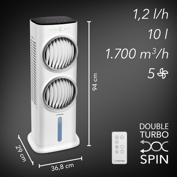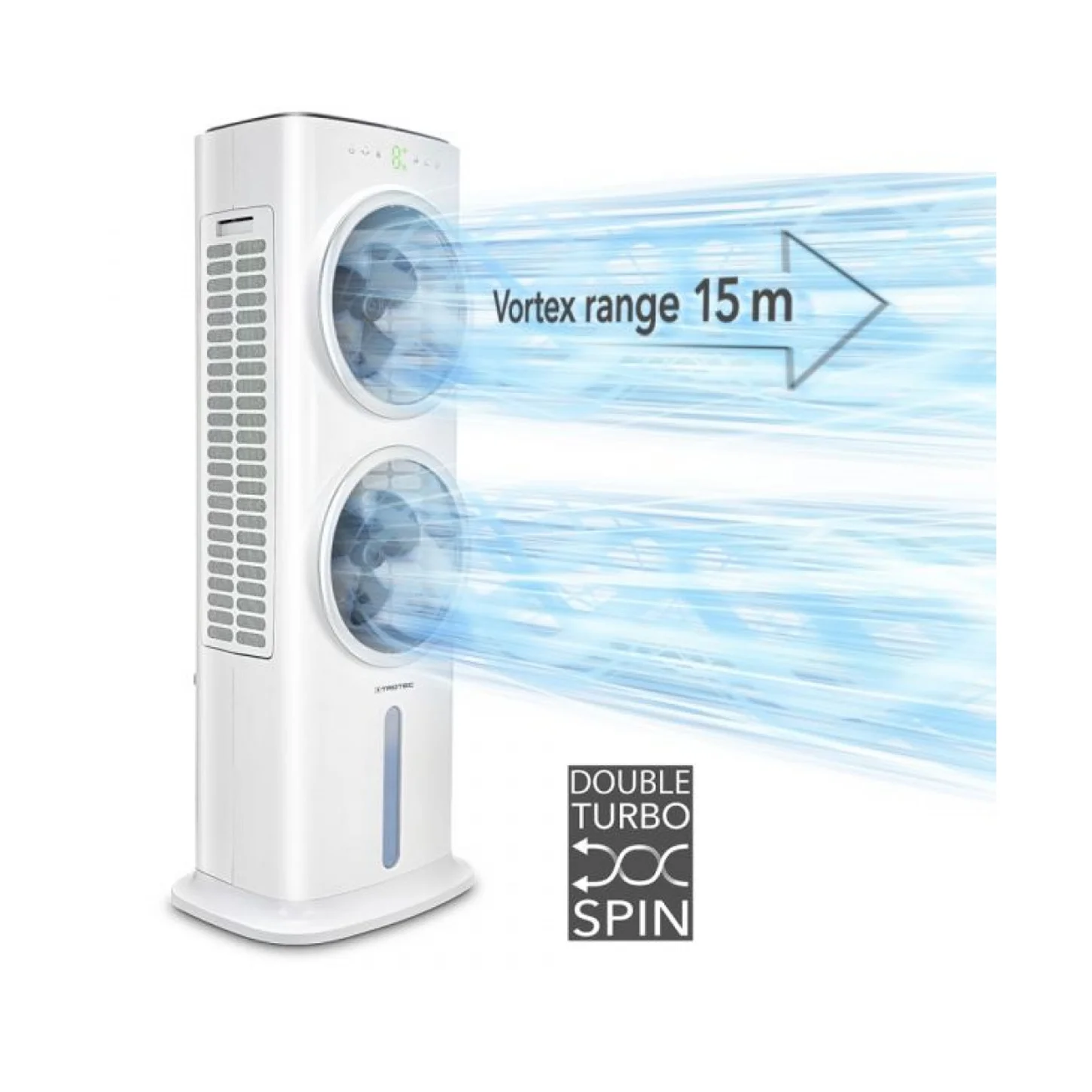 Turbo centrifuga hladnjaka zraka stvara ravnomjernu cirkulaciju hladnog zraka kroz sobu. Topli zrak koji u uređaj ulazi s tri strane hladi se, a zatim udara u aerodinamično oblikovane lopatice rotora izuzetno brzo rotirajućih rotora ventilatora visokih performansi. Zahvaljujući vrtložnoj tehnologiji, duboko zakrivljene lopatice ventilatora osiguravaju posebno snažne turbulencije i ogromno ubrzanje protoka zraka. Sa svojim izlazom zraka od 1.700 m³ / h, PAE 45 je i do 3 puta snažniji od usporedivih hladnjaka zraka. Jako stlačene zračne struje, kovitlane poput stlačenog tornada, izbijaju iz uređaja kao dva rotirajuća stupa hladnog zraka i prodiru do 15 metara u sobu. Ako izlazne zračne struje udare o zid ili strop, one će se odraziti na sve strane. Zrak struji preko zidova i stropa u stalnoj cirkulaciji natrag prema stražnjem dijelu hladnjaka zraka. Tu se opet usisava i ciklus započinje ispočetka. Zahvaljujući ovom učinkovitom principu turbo vrtnje, zrak u vašoj sobi miješa se i cirkulira u najvećoj mogućoj mjeri. Učinak hlađenja zračnih struja osjeća se u cijeloj sobi!