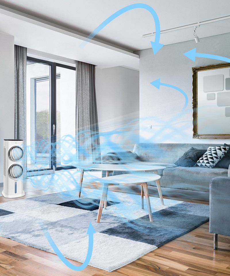 Učinkovito hlađenje pomoću zraka uz nisku potrošnjju energije. Ovaj air cooler koristi hladnu ili zamrznutu vodu kako bi ventilatorom ravnomjerno rashladio prostor. Spremnik za vodu od 4l.
