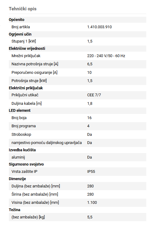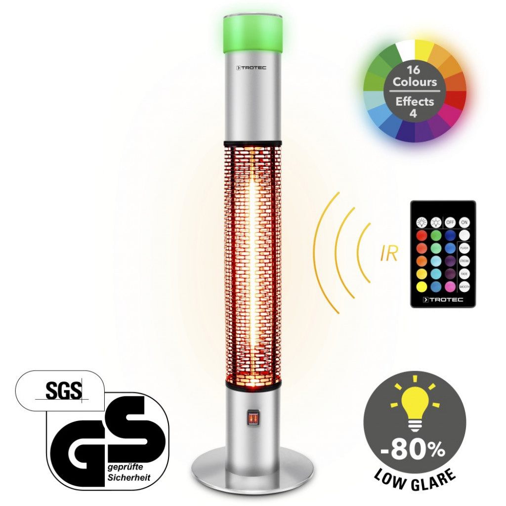 Njegovo moderno aluminijumsko kućište visoko 110 cm savršeno se uklapa u moderne vanjske prostore. Infracrvena cijev sa niskim odsjajem od 1500 vati emituje, bez predgrevanja, čak i toplotu u svim smerovima koja je direktno efikasna na celoj dužini grejnog elementa.