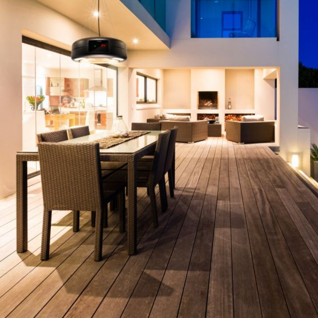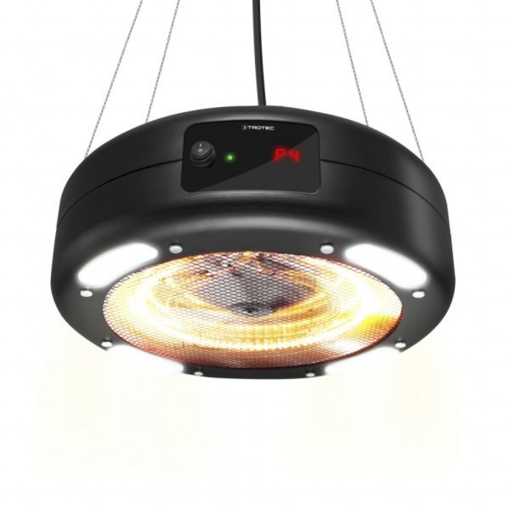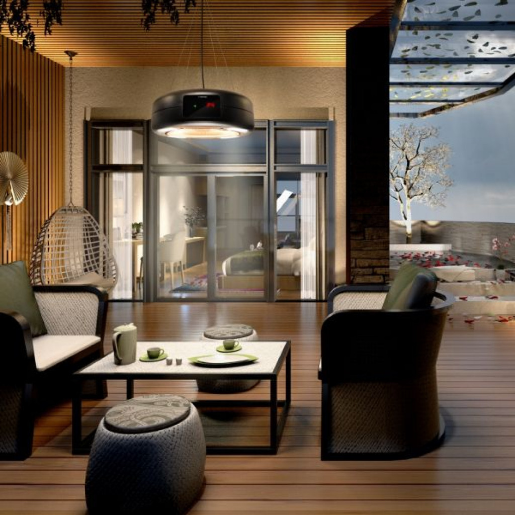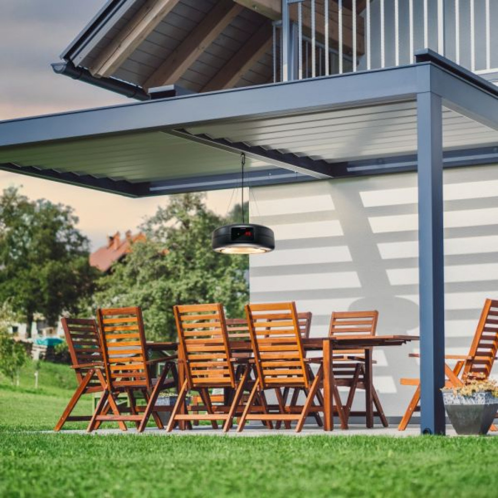 Moderna 1.500 W infracrvena stropna grijalica zanimljivog izgleda, s tri razine grijanja, LED osvjetljenjem i daljinskim upravljačem, za vanjsku upotrebu