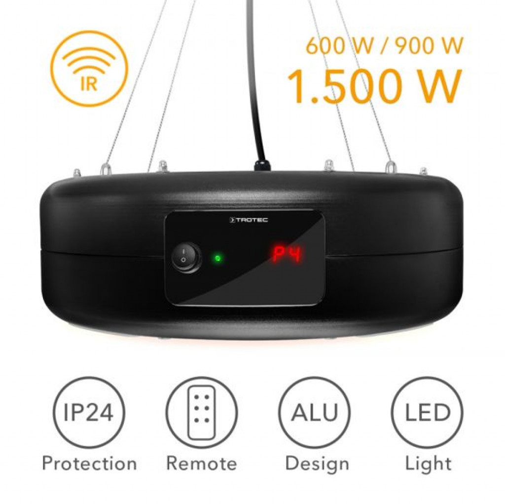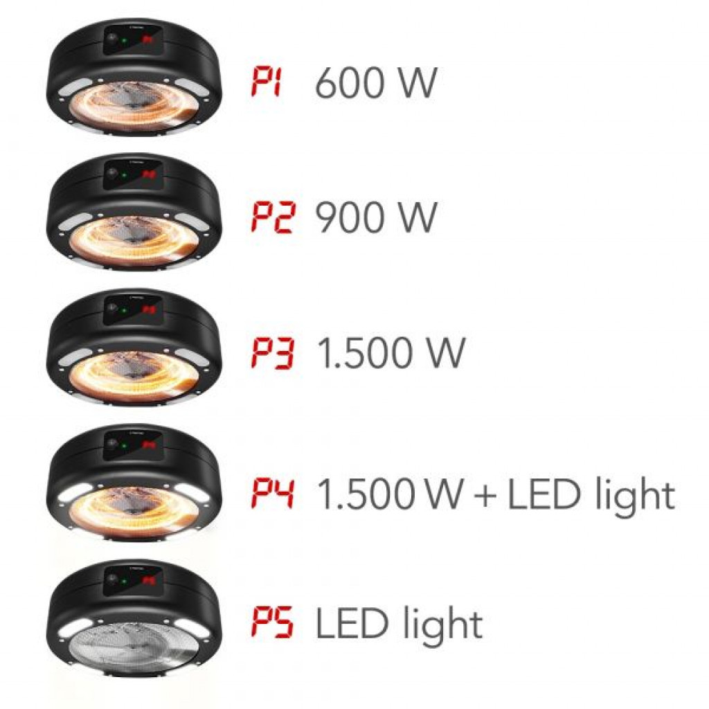 Dvije halogene cijevi visokih performansi s tri razine grijanja (600 W / 900 W / 1500 W) uvijek isporučuju onoliko korisne trenutne topline koliko mjesto i namjena zahtijevaju. Po potrebi se mogu uključiti četiri svijetle LED reflektore (može se koristiti i bez aktiviranog grijanja), pri čemu se stropni grijač pretvara u funkcionalnu radnu svjetiljku ili moderan dodatak. Razine grijanja i načini rada biraju se jednostavno i praktično pomoću praktičnog infracrvenog daljinskog upravljača.