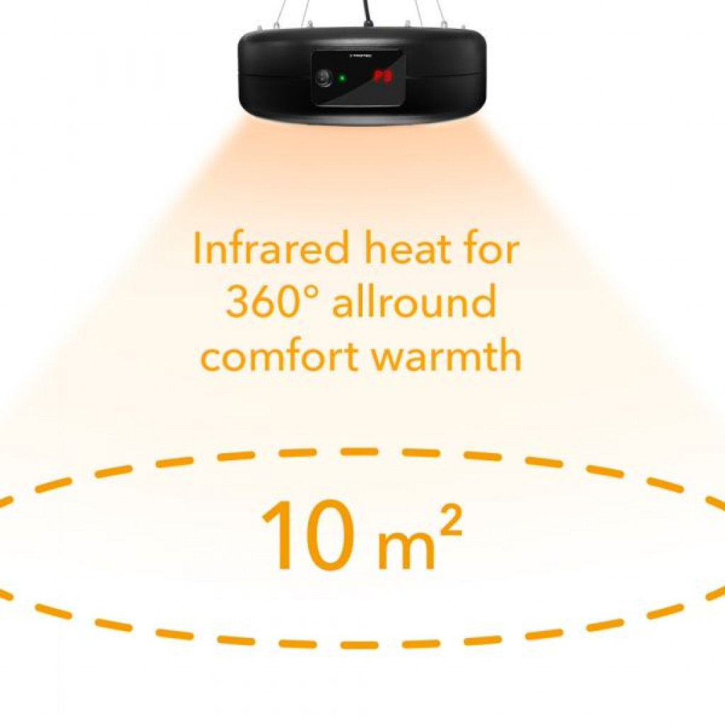 Toplina od 360° koja zrači prema dolje iz reflektorskog kišobrana velikog 45 cm može se osjetiti na površini od 10 m². Za razliku od konvencionalnih konvektora, IR 1550 SC zagrijava kožu izravno, a ne zrak iz okoline. Infracrvenu toplinu, koja je posebno ugodna, koža odmah apsorbira i pohranjuje. Zahvaljujući ovom aktivnom principu, IR 1550 SC zagrijava osjetno intenzivnije i energetski učinkovitije od ostalih tehnologija grijanja - i bez neugodnih mirisa ili zvukova. Grijač, težak oko 3,5 kg, pričvršćen je na strop s četiri čelična užad za pričvršćivanje (zatezna žica) koja su uključena u isporuku. Mreža s bliskim mrežama štiti grijaće šipke od radoznalih dječjih prstića i slučajnih dodira.