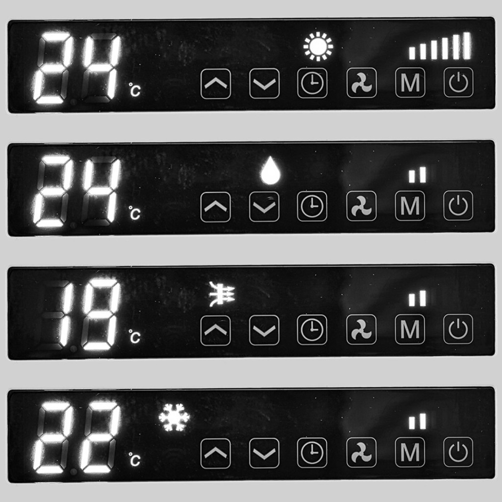 Dodatne funkcije: Funkcija odvlaživanja, funkcija ventilacije, App function, WLAN-Funktion, Auto restart function, modus za uštedu energije, Compressor protection, Quiet operation, Self-evaporation function, Sensor-controlled temperature indication, Automatska dijagnoza pogrešaka, Funkcija Swing, Način rada Sleep, funkcija Memory , funkcija grijanja, Indication of the current room temperature, Overheating protection, automatska funkcija