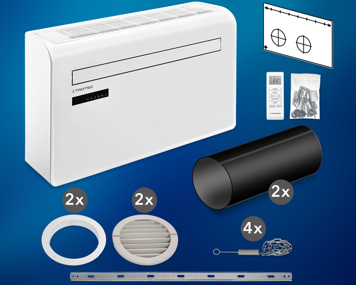 Klima uređaj PAC‑W 2650 SH namijenjen je samo za unutarnju ugradnju i može se postaviti i kao škrinja (iznad poda) i kao zidna jedinica (na zid / ispod stropa). Instalacija se odvija bez ometanja vanjske jedinice. Potrebne su samo dvije rupe (Ø 18 cm) na zidu koji vodi prema van kako biste instalirali uređaj modernog dizajna na zid u zatvorenom prostoru. Fasada kuće ostaje uglavnom nepromijenjena. Vidljiva su samo dva diskretna ventilacijska otvora. Svježi zrak ulazi u prostoriju kroz ove dovodne i odvodne kanale, a toplina se prenosi iznutra prema van.