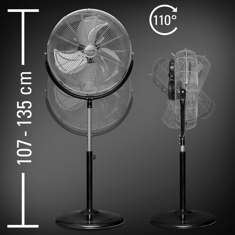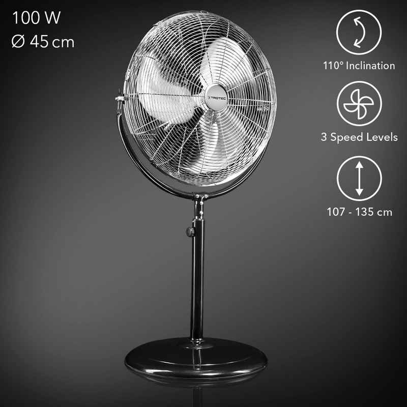 Stojeći ventilator TVM 18 S održava hladnoću čak i na vrućim danima, i brzo osigurava potrebno hlađenje. Zahvaljujući učinku od 120 W, promjeru krila ventilatora od 18 inča (oko 45 cm) kao i izlaznu poziciju zbog produžive i podesive teleskopske cijevi, ventilator hladi i velike prostorije. Uređaj ima superiornu rezervu snage kako bi osigurao dostatno hlađenje čak i pri vrlo visokim temperaturama.