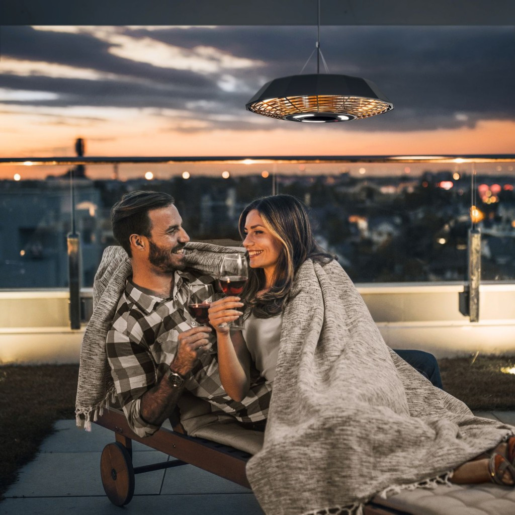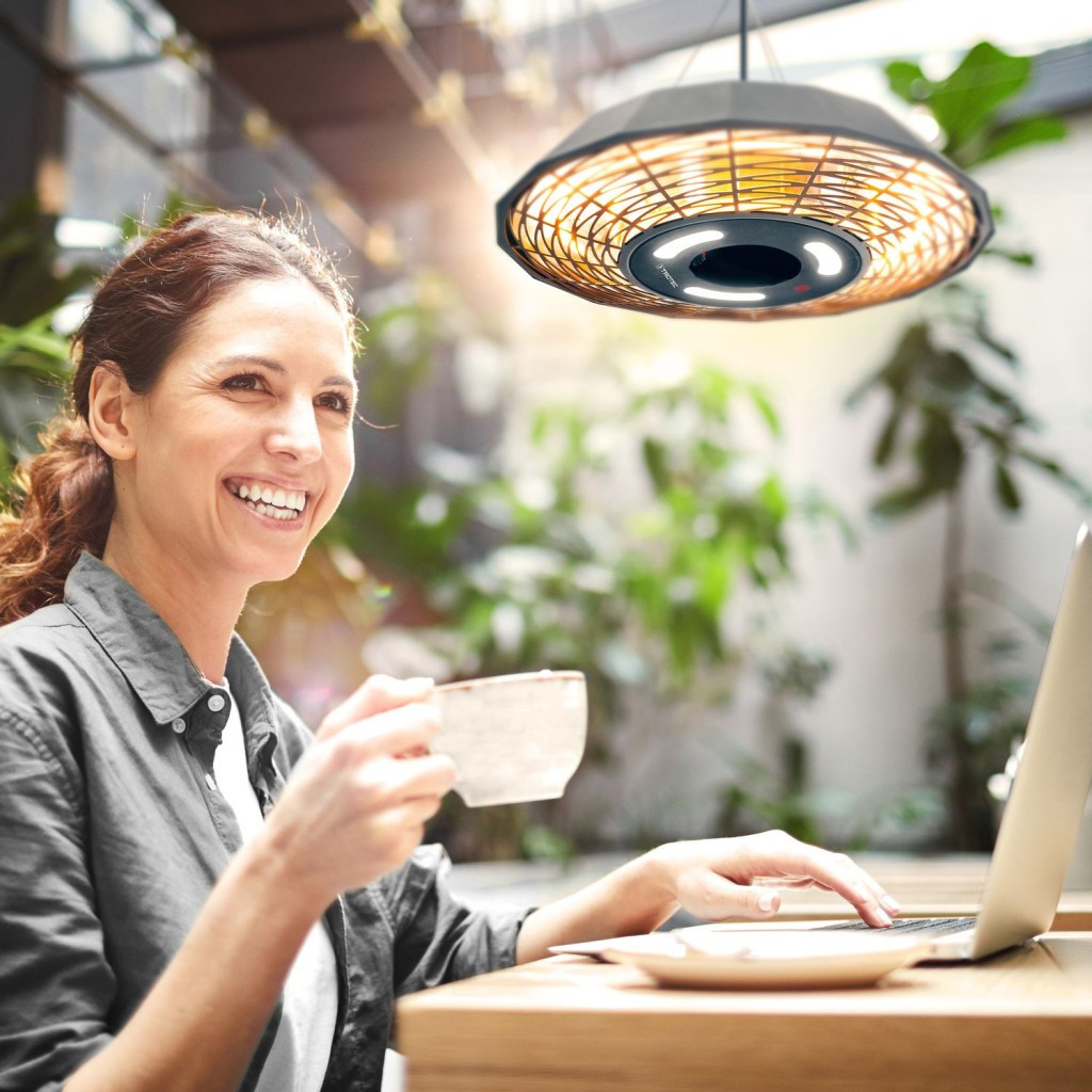 Geometrijski oblikovan stropni grijač od 2000 W IR 2010 SC premošćuje jaz između izvanrednog dizajna proizvoda i dobro promišljene funkcionalnosti. Dizajniran za jednostavno grijanje nenatkrivenih površina na otvorenom, mat crni radijator u poligonskom dizajnu pruža prostore za sjedenje i stajanje u otvorenim restoranima, balkonima i terasama s brzom i ugodnom infracrvenom toplinom. Po potrebi se putem daljinskog upravljača može uključiti trosvjetna LED stolna rasvjeta kako bi se stvorio atmosferski ugođaj s toplim bijelim svjetlom. Mreža s uskim mrežama štiti grijaću cijev od radoznalih dječjih prstića i slučajnog dodira. Optimalni uvjeti za osjetno ugodniji boravak na otvorenom i značajno povećanje prometa za restorane u hladnoj zimi.