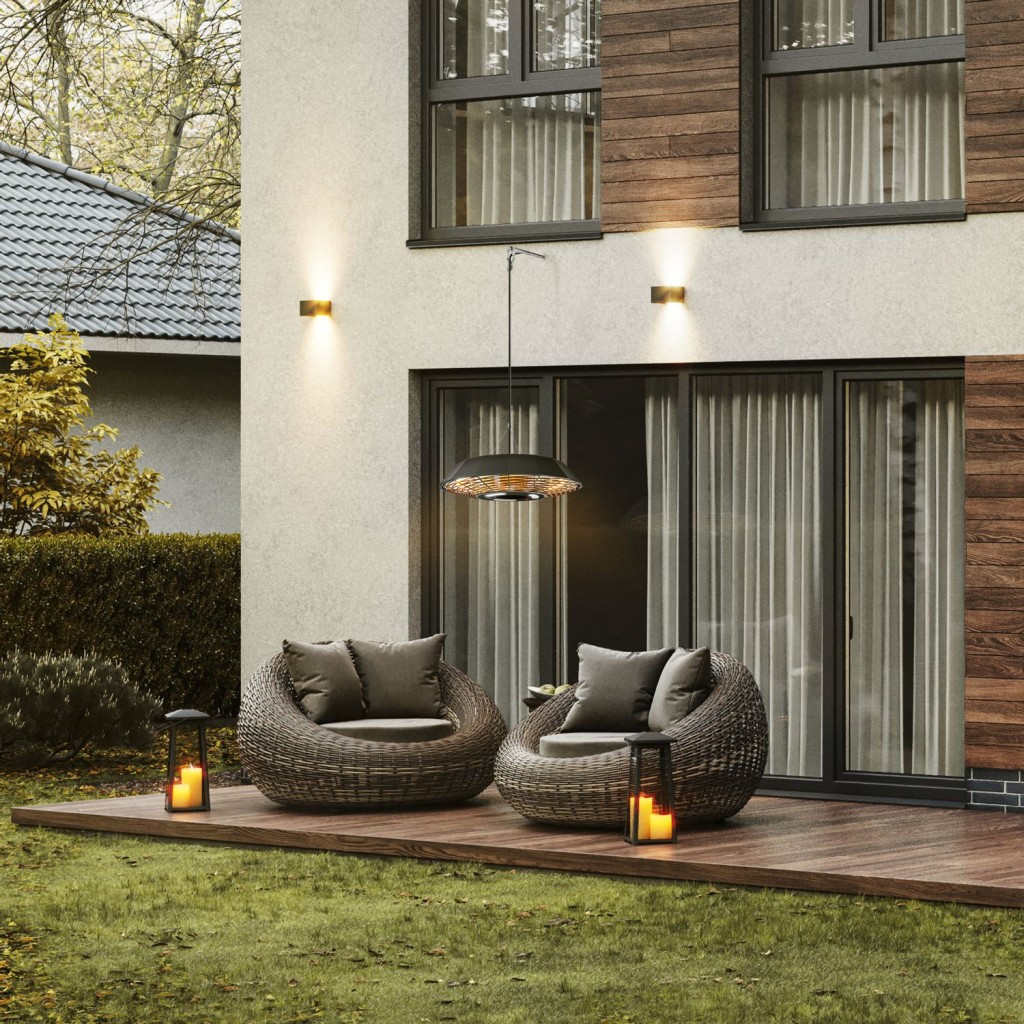 Dizajnerski stropni reflektor IR 2010 SC od 2000 W impresionira modernim poligonskim dizajnom i pruža relativno jeftinu toplinu od 360° i toplo ambijentalno svjetlo. Infracrvena toplina se razvija odmah nakon što ste uključili uređaj pomoću prekidača za uključivanje/isključivanje s radnom kontrolnom lampicom. Ugodna atmosfera s brzom toplinom i LED svjetlom u vanjskim prostorima. IR 2010 SC to omogućuje!