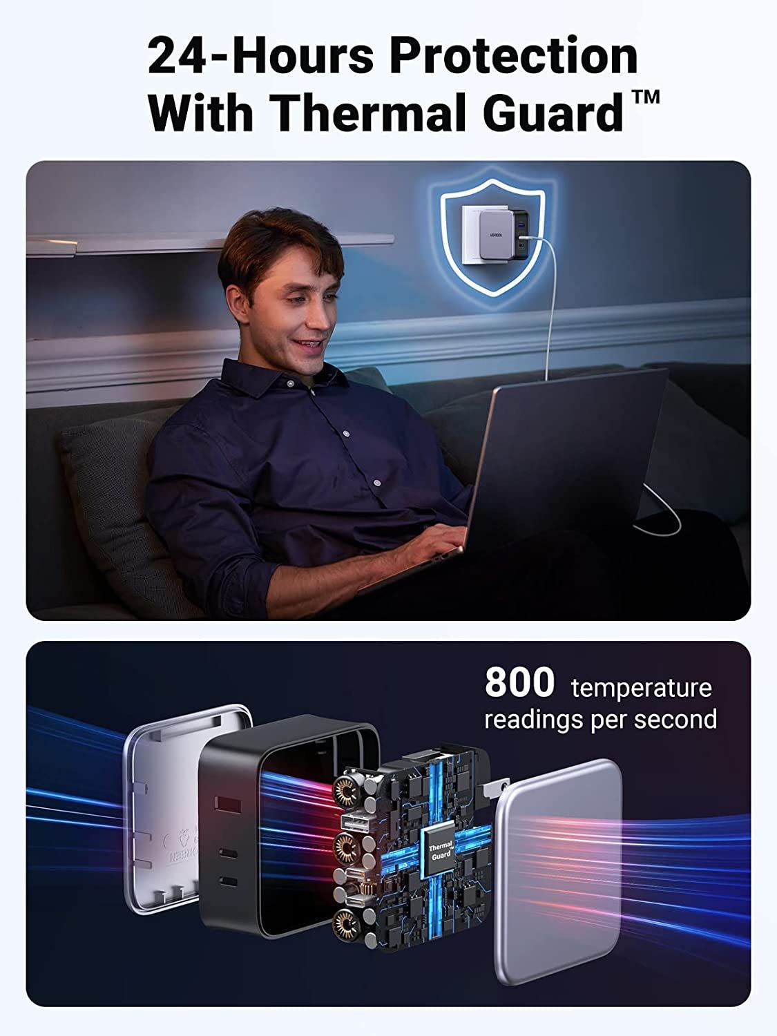 140W USB C punjač sa Ugreen Thermal Guard tehnologijom i Power Dispenser sistemom osigurava sigurno i bezbrižno iskustvo punjenja. Thermal Guard mjeri temperaturu u realnom vremenu 800 puta u sekundi kako bi zaštitio vaše uređaje od pregrijavanja; Power Dispenser sistem inteligentno prilagođava izlaznu snagu kako bi zaštitio bateriju vašeg uređaja i produžio njen vijek trajanja.