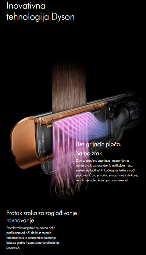 Jedini uređaj za ravnanje kose s motorom Dyson Hyperdymium™. Za snažan, usmjeren protok zraka koji zaglađuje i ravna kosu.