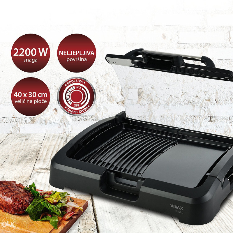 Počastite se hranom sa roštiljem unutar svog doma, u bilo kojem godišnjem dobu. Uz pomoć Vivax električnog roštilja EG-4030RC ne treba Vam vrt i velika terasa da uživate u mirisnim roštiljima. Stakleni poklopac će vam pomoći da Vaša hrana ostane što duže i što duže zadrži toplinu. Snaga 2000W, dimenzije neljepljive površine za pečenje 40x30cm, kombinacija rebraste i glatke površine, termostat za podesivu temper aturu pečenja, odvojivi dijelovi uređaja za lakše čišćenje ,odvojiva posuda za masnoću, temperirani stakleni poklopac. Snaga 2000 W, povrsina za pečenje: 40 x 30 cm, neljepljiva površina, pola ravna ploča, pola rebrasta, stakleni poklopac za očuvanje hrane sočnom i toplom